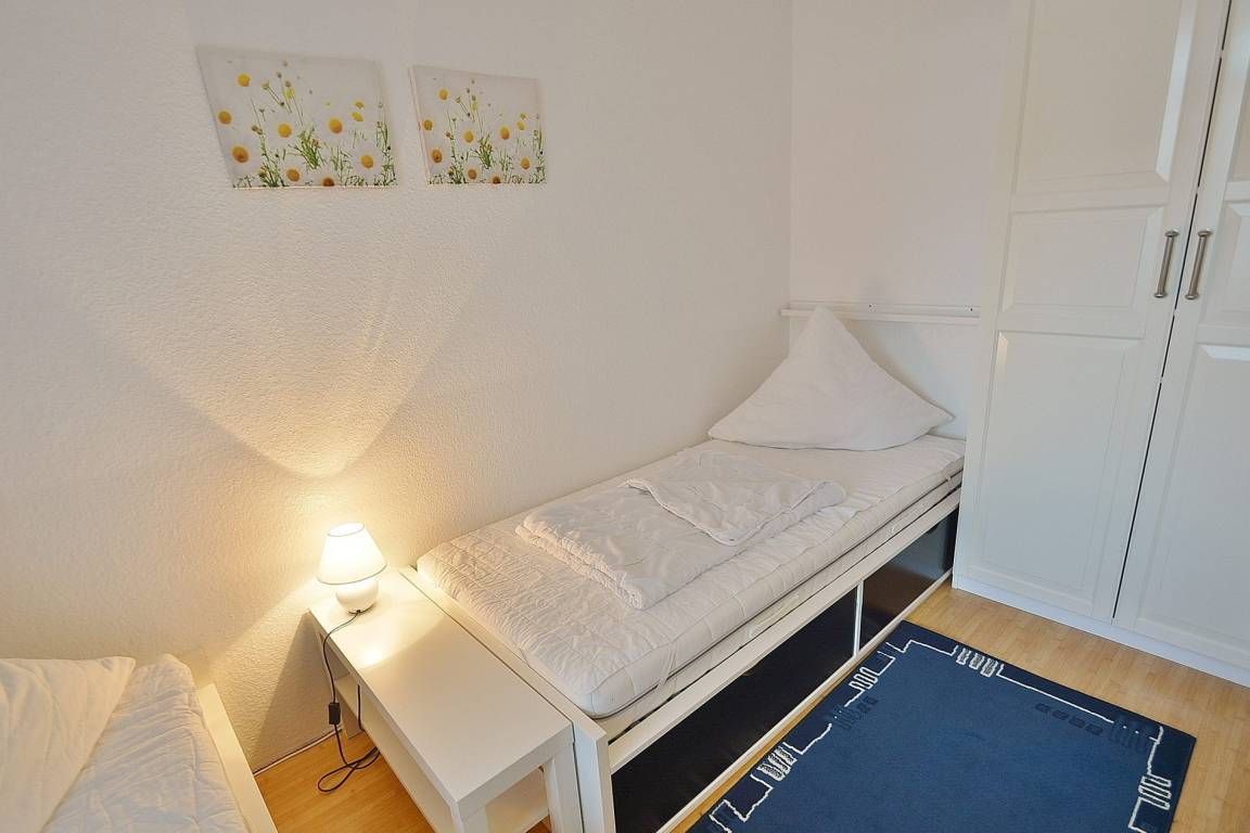 Freundliches Schlafzimmer mit Fenster zum Laubengang. Das Schlafzimmer ist mit 2 getrennten Betten (90x200cm) und einem Kleiderschrank ausgestattet. Ein weiterer Kleiderschrank befindet sich im Flur vor dem Bad. Das Schlafzimmer ist mit Laminatboden ausgelegt. Das Fenster zum Laubengang lässt sich durch einen Außenrollladen vollständig verdunkeln.