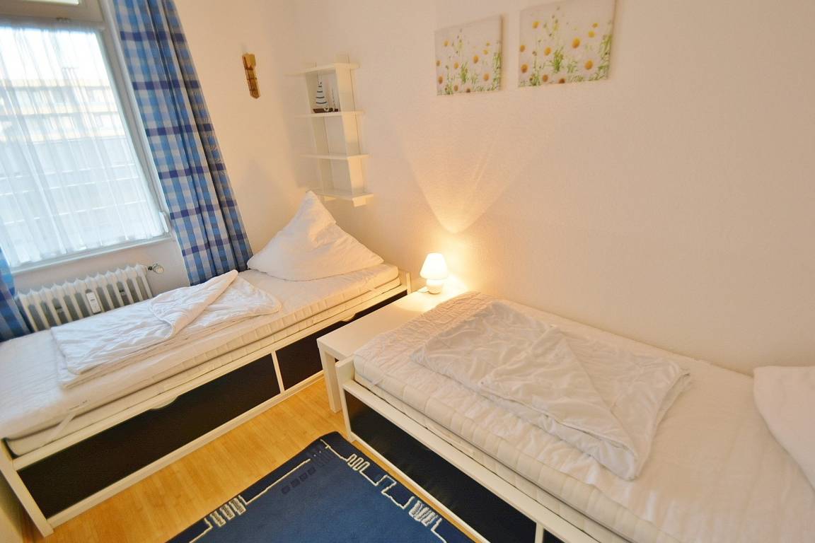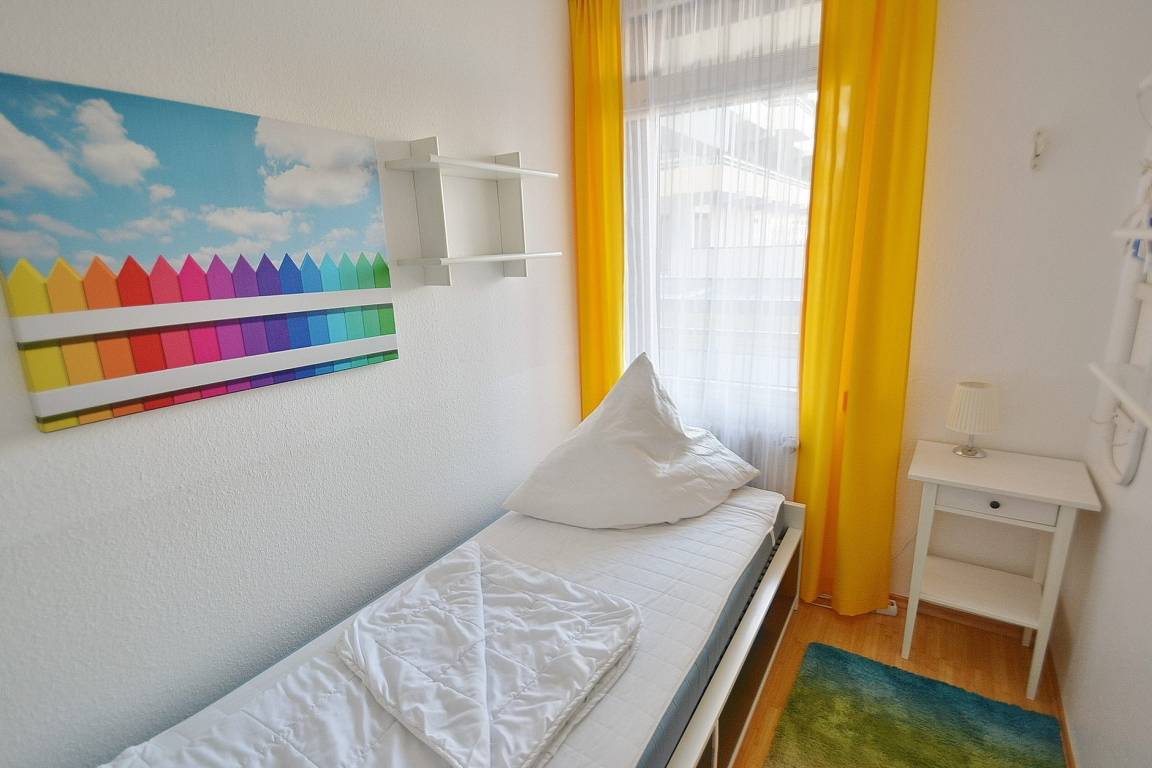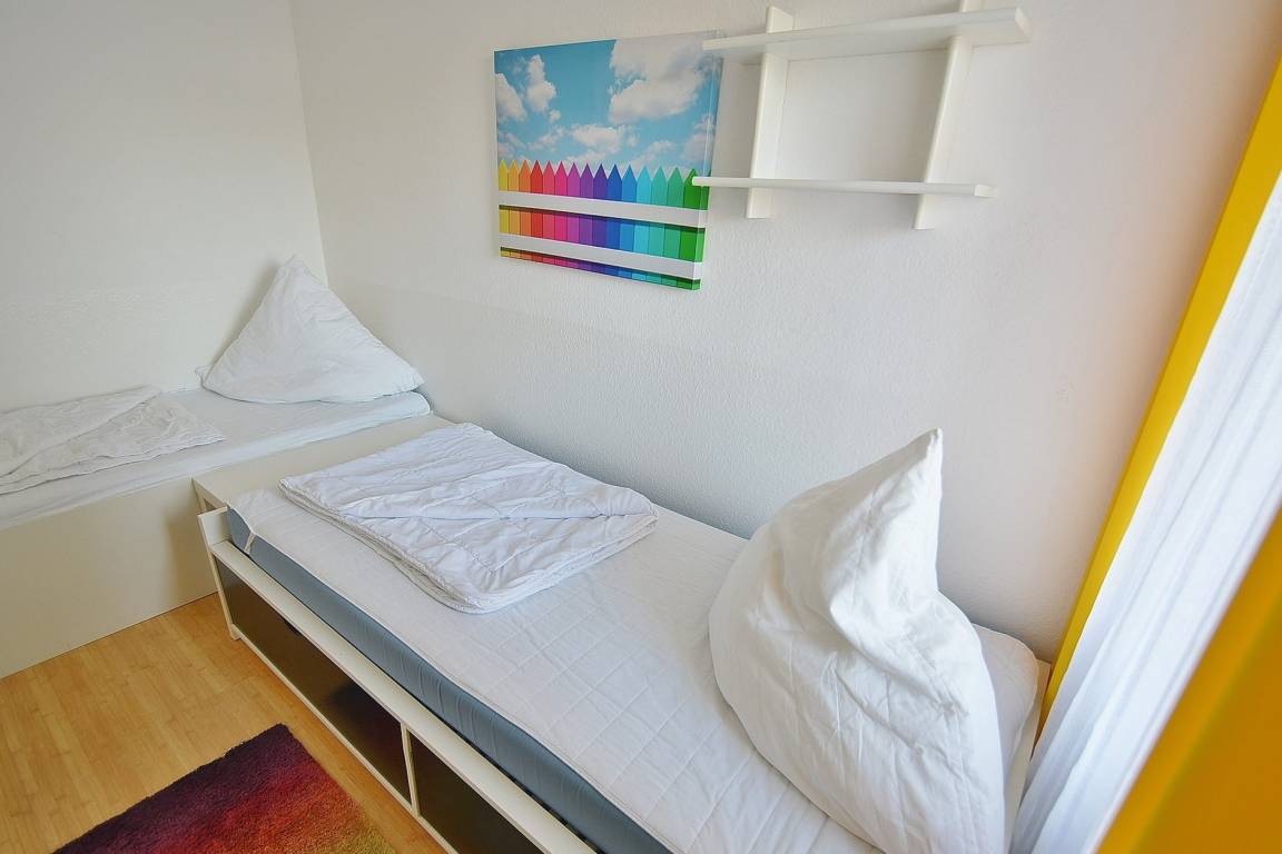 Freundliches Kinderzimmer mit Fenster zum Laubengang. Das Kinderzimmer ist mit 2 getrennten Betten (90x200cm und 80x180cm) ausgestattet und mit Laminatboden ausgelegt. Das Fenster zum Laubengang lässt sich durch einen Außenrollladen vollständig verdunkeln.