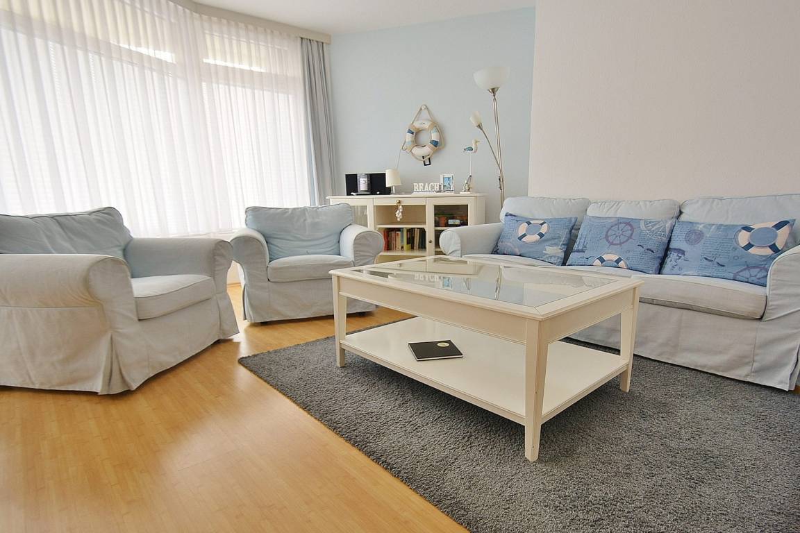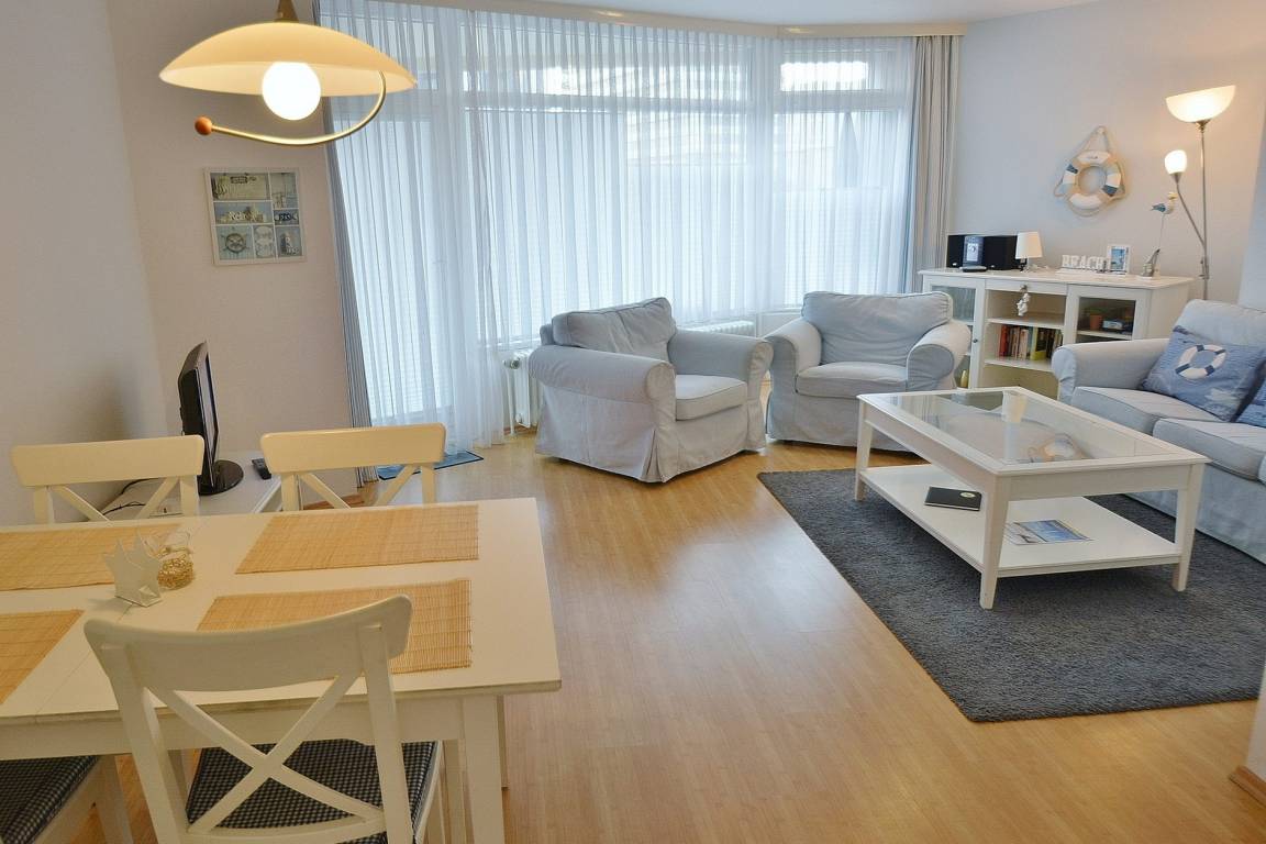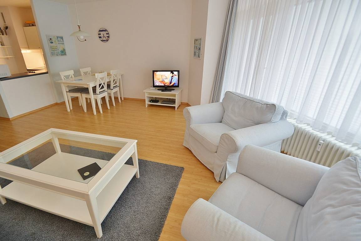 Helles, freundliches und modernes Wohn- und Esszimmer mit direktem Zugang zum großen Balkon. Das Wohn- und Esszimmer ist mit einer 3-er Couch und 2 Sesseln, einem Couchtisch, einer Kommode und einem Essplatz für 4 Personen ausgestattet. Ein Fernseher mit DVD-Player und eine Ministereoanlage mit CD-Player stehen zur Unterhaltung bereit. Das Wohn- und Esszimmer ist mit Laminatboden ausgelegt.