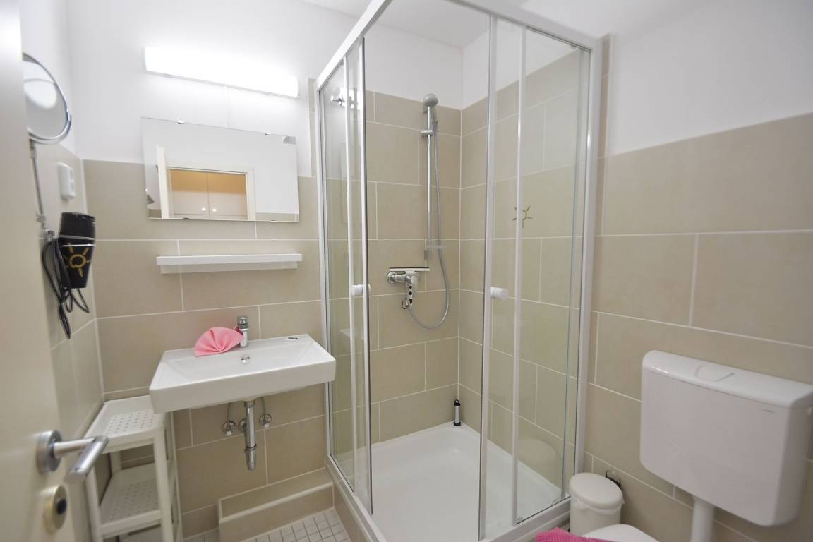 Helles, freundliches Badezimmer mit Dusche, Toilette und Waschbecken.