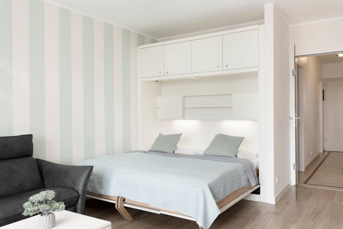 Ihr Urlaubsdomizil in der 5. Etage des Hauses Miramar erreichen Sie bequem mit dem Fahrstuhl. Ihre Ferienwohnung hat ein modernes Duschbad, eine voll ausgestattete Küche, ein Schlafzimmer mit Doppelbett (180x200 cm) und Fernseher, verdunkelndem Innenrollo und ausreichend Schrankraum.