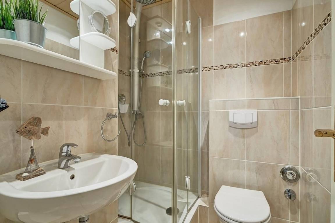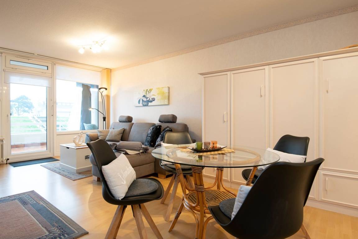 Der lichtdurchflutete Wohn- und Essbereich ist mit einem gemütlichen Ecksofa, einem Esstisch mit 4 Stühlen, einem Flat-TV sowie einer Spielesammlung und diversen Büchern ausgestattet. Das vorhandene Schrankbett (140x200 cm) dient als Schlafmöglichkeit für 2 Personen und ist vom Flur aus über 3 Stufen zu erreichen. Die moderne Küchenzeile ist in den Wohnbereich integriert und mit Annehmlichkeiten wie Kühlschrank mit Gefrierfach, Spülmaschine, Cerankochfeld, Backofen und Mikrowelle ausgestattet. Vom Wohnbereich geht es direkt auf den großzügig geschnittenen und ebenso geschützten Balkon mit Südostausrichtung. Dieser bietet mit einer Fläche von ca. 12 m² eine weitere herrliche Aufenthaltsmöglichkeit mit frischer Seeluft und Blick über den Deich! Ein Sonnenschirm schützt an sonnigen Tagen vor zu starker Sonneneinstrahlung. Im Schlafzimmer befinden sich ein Doppelbett (2x 90x200 cm), 2 Nachttische, ein Flat-TV sowie ein geräumiger Kleiderschrank mit Safe. Ein kostenfreier W-LAN Anschluss steht Ihnen selbstverständlich zur Verfügung. Außenjalousien sorgen für angenehme Verdunklung. Das hell geflieste Badezimmer ist komfortabel mit Eckdusche, WC, Waschbecken und Spiegel ausgestattet.