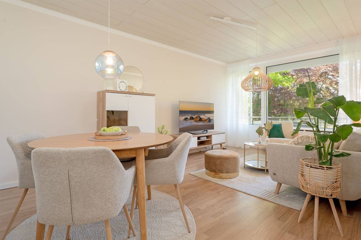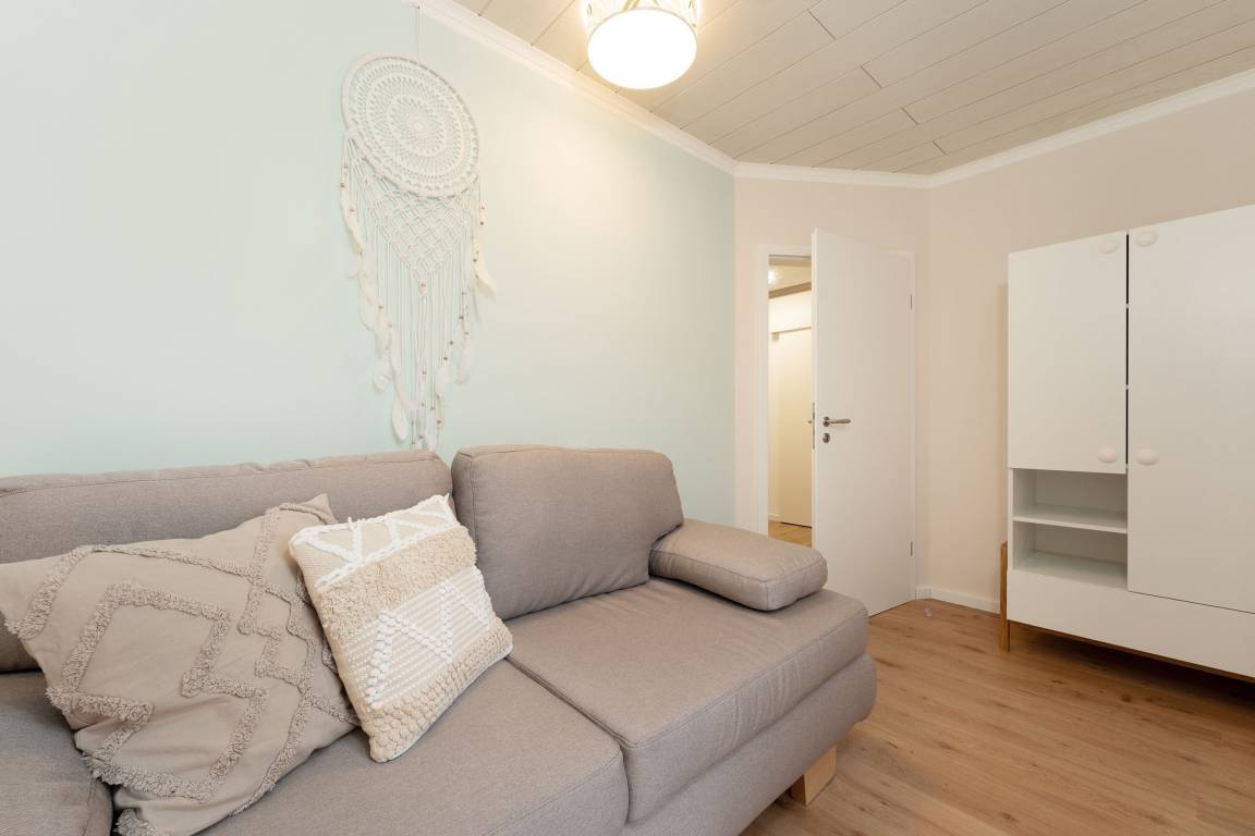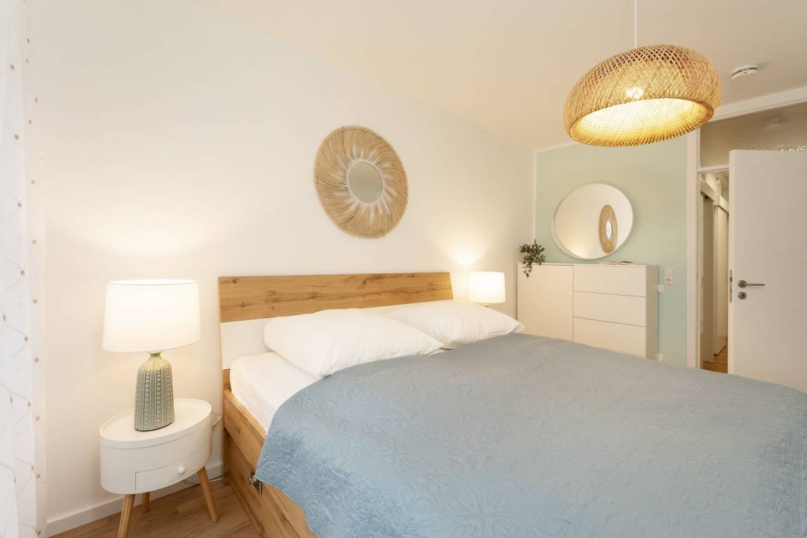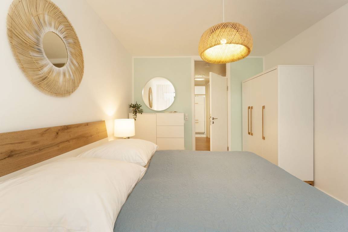 Schon der Eingangsbereich empfängt Sie in frischen Tönen mit einer hellen Garderobe sowie Schuhschrank. Die gut ausgestattete separate Küche mit Nespresso-Maschine inkl. Milchaufschäumer bietet Ihnen alle Annehmlichkeiten, um sich auch im Urlaub Ihre Lieblingsspeisen zuzubereiten. Diese können Sie dann im gemütlichen Ess- und Wohnbereich im Boho-Stil oder auf dem möblierten Balkon mit Blick ins Grüne genießen. Zum Schlafen können Sie sich in das Hauptschlafzimmer mit Sitzecke und Doppelbett (2 x 90x200 cm) mit exotischem Flair zurückziehen oder Ihre Wahl fällt auf das zweite angrenzende Schlafzimmer. Die darin befindliche Schlafcouch kann als Übernachtungsmöglichkeit für zwei weitere Gäste (140x200 cm) fungieren. Ein Babybett steht Ihnen für die Zeit Ihres Aufenthaltes zur Verfügung. Beide Schlafzimmer bieten ausreichend Stauraum mit Regal und Kleiderschrank. Das moderne Duschbad mit geräumiger Dusche, Waschtisch und Spiegelschrank sowie praktischem Handtuchheizkörper macht Ihr Urlaubsdomizil komplett.