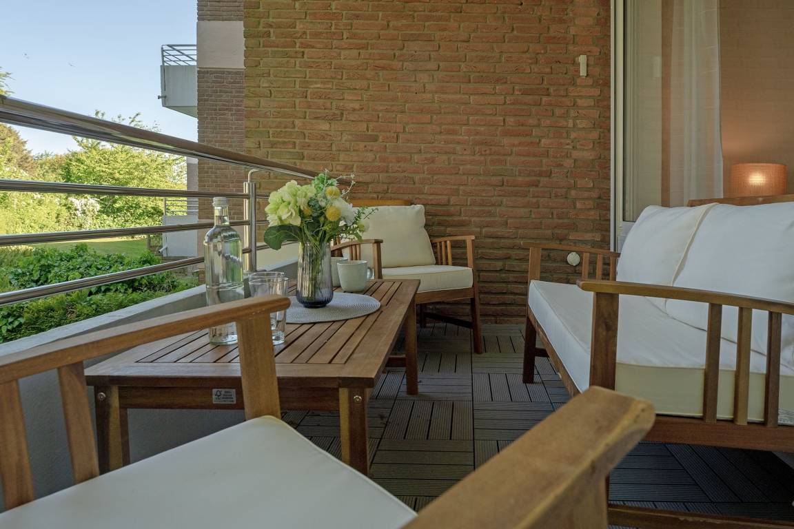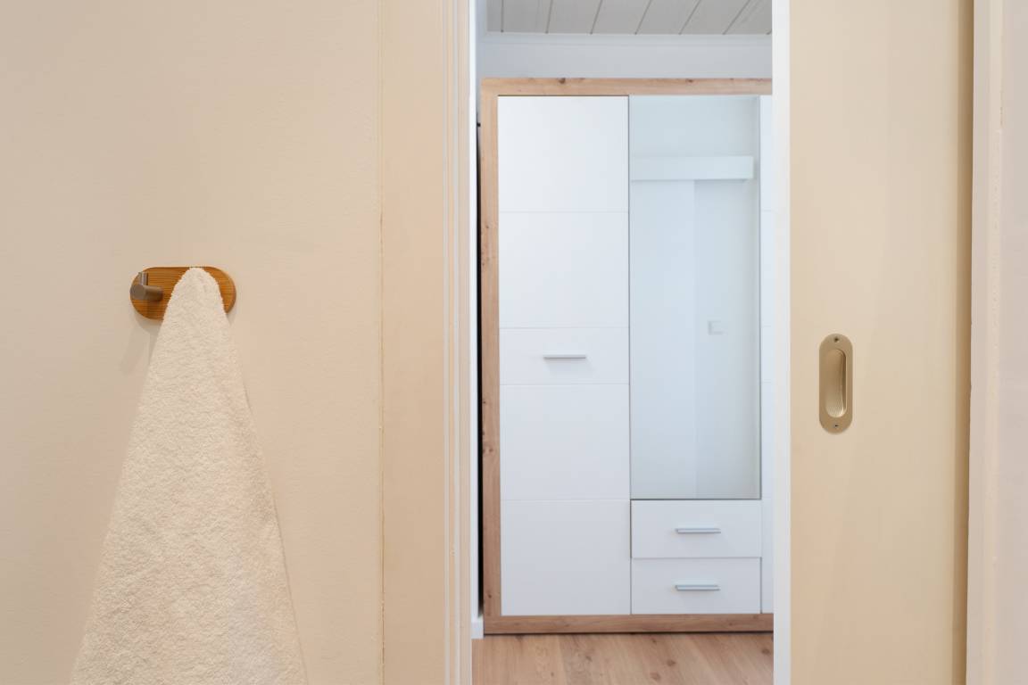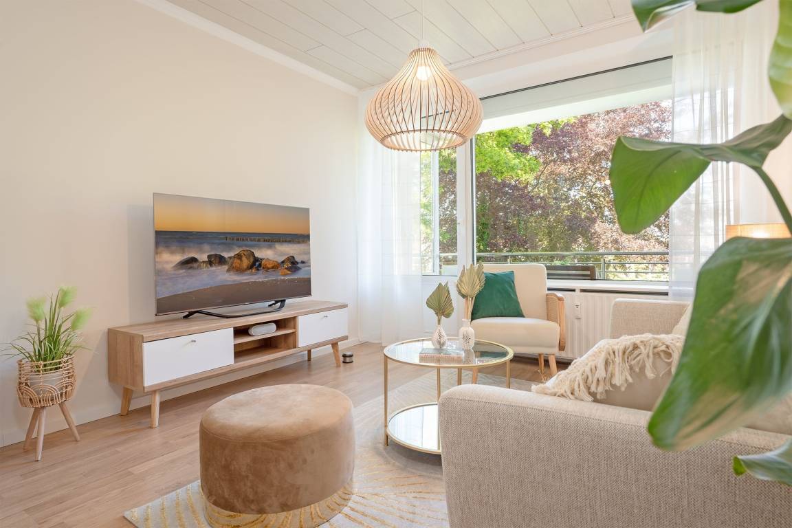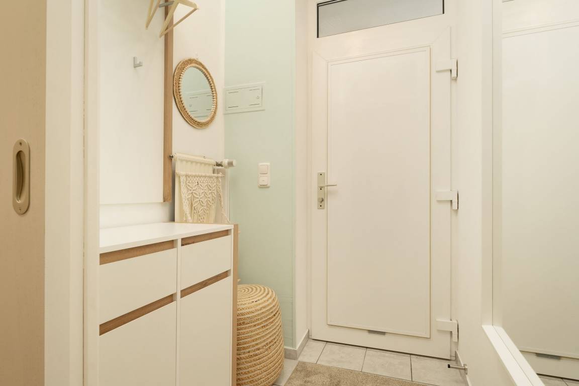 Schon der Eingangsbereich empfängt Sie in frischen Tönen mit einer hellen Garderobe sowie Schuhschrank. Die gut ausgestattete separate Küche mit Nespresso-Maschine inkl. Milchaufschäumer bietet Ihnen alle Annehmlichkeiten, um sich auch im Urlaub Ihre Lieblingsspeisen zuzubereiten. Diese können Sie dann im gemütlichen Ess- und Wohnbereich im Boho-Stil oder auf dem möblierten Balkon mit Blick ins Grüne genießen. Zum Schlafen können Sie sich in das Hauptschlafzimmer mit Sitzecke und Doppelbett (2 x 90x200 cm) mit exotischem Flair zurückziehen oder Ihre Wahl fällt auf das zweite angrenzende Schlafzimmer. Die darin befindliche Schlafcouch kann als Übernachtungsmöglichkeit für zwei weitere Gäste (140x200 cm) fungieren. Ein Babybett steht Ihnen für die Zeit Ihres Aufenthaltes zur Verfügung. Beide Schlafzimmer bieten ausreichend Stauraum mit Regal und Kleiderschrank. Das moderne Duschbad mit geräumiger Dusche, Waschtisch und Spiegelschrank sowie praktischem Handtuchheizkörper macht Ihr Urlaubsdomizil komplett.