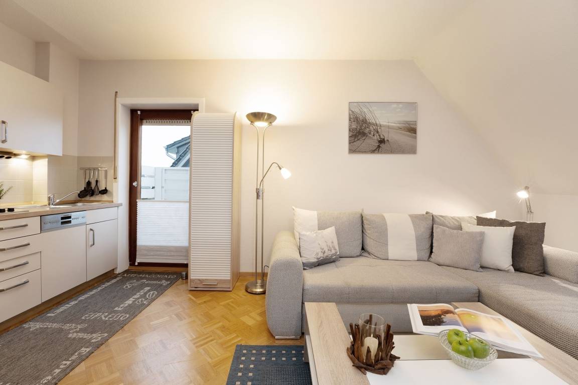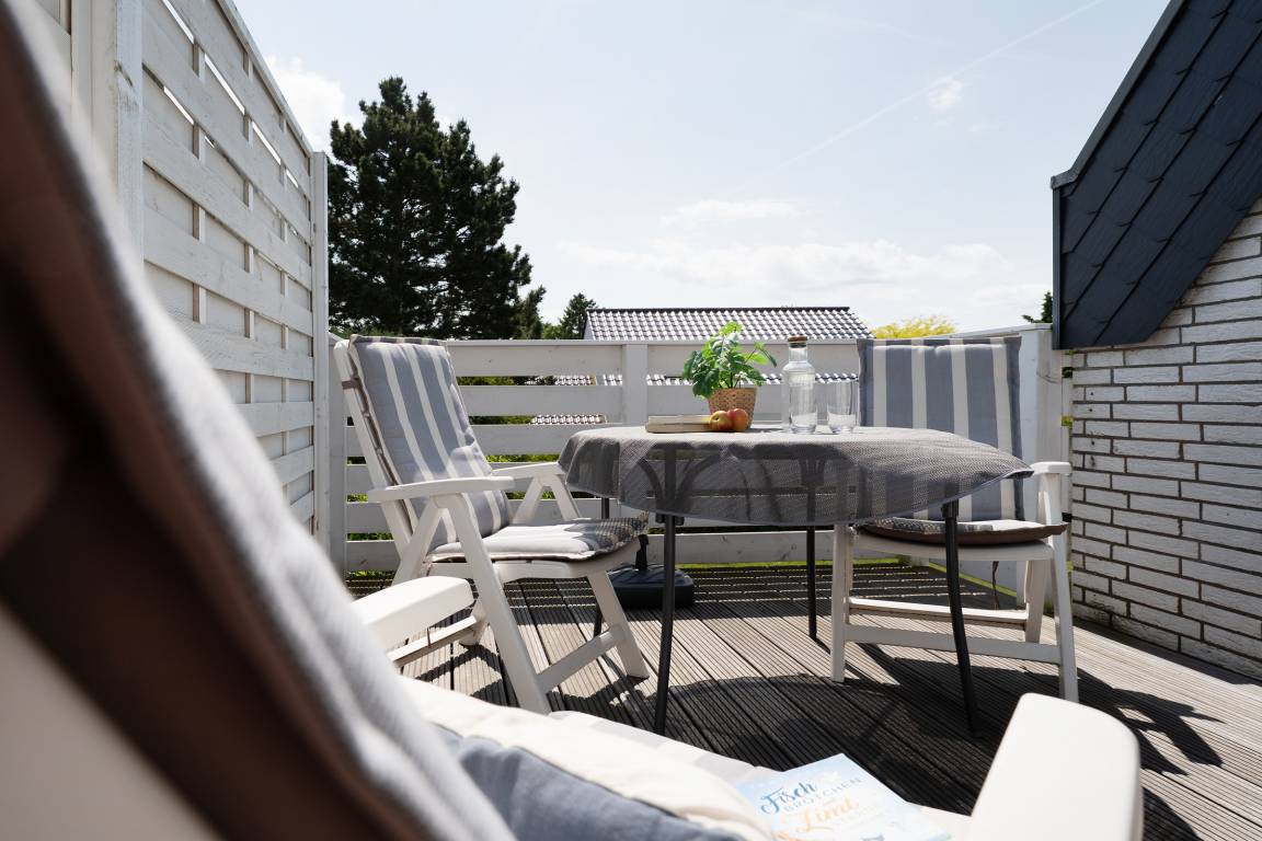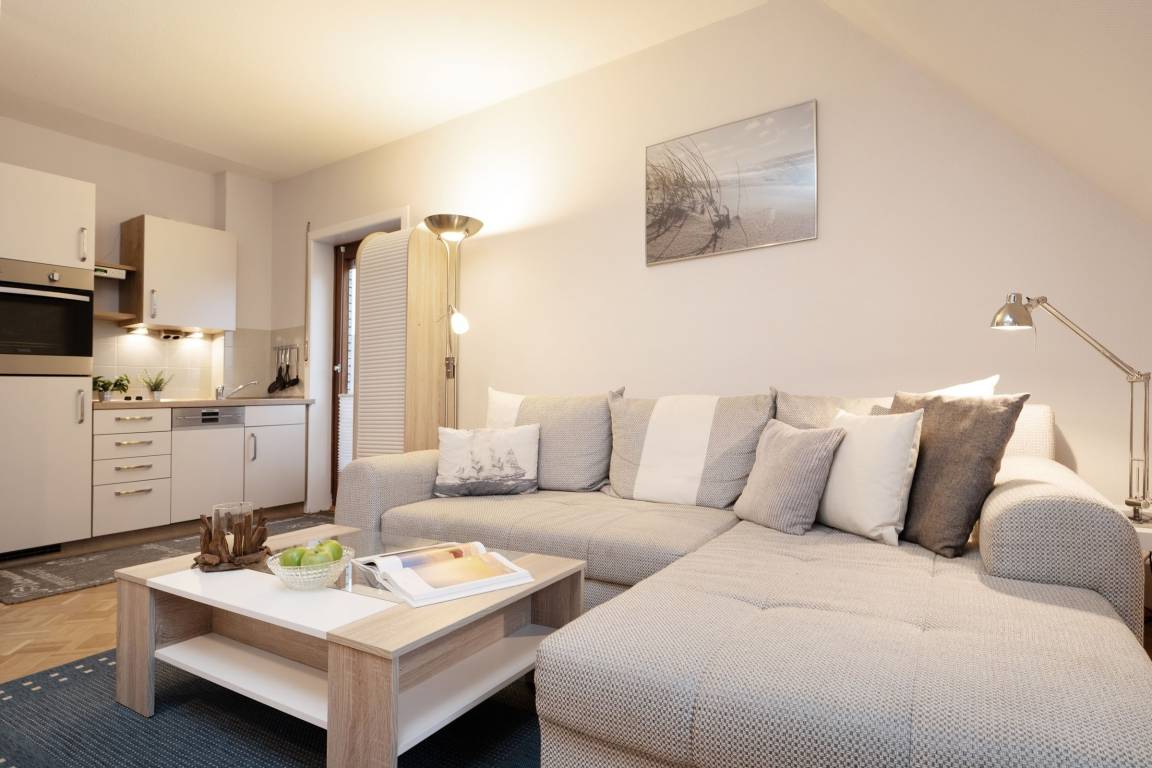 Der offen gestaltete Wohn-/Essbereich umfasst eine gemütliche Sitzecke, einen Esstisch sowie die offene Küchenzeile und begrüßt Sie lichtdurchflutet, mit gemütlicher und moderner Einrichtung. Die integrierte Küchenzeile überzeugt mit hochwertiger Ausstattung wie einem Backofen in angenehmer Arbeitshöhe sowie einer Spülmaschine. Machen Sie es sich nach langen Strandtagen auf dem großzügigen Ecksofa mit Schlaffunktion (Liegefläche 150x200cm) bequem, ein Flatscreen-TV sorgt für Unterhaltung. Vom Wohnbereich aus führt ein direkter Zugang auf die möblierte Dachterrasse mit Südostausrichtung, freuen Sie sich auf herrliche Sonnenstunden inklusive frischer Ostseeluft! Das separate Schlafzimmer ist mit einem komfortablen Boxspringbett (180x200 cm) und Kleiderschrank ausgestattet, durch Außenjalousien ist Verdunklung für die Nacht gewährleistet. Das geschmackvolle Tageslichtbad in warmen Naturtönen bietet viel Komfort.