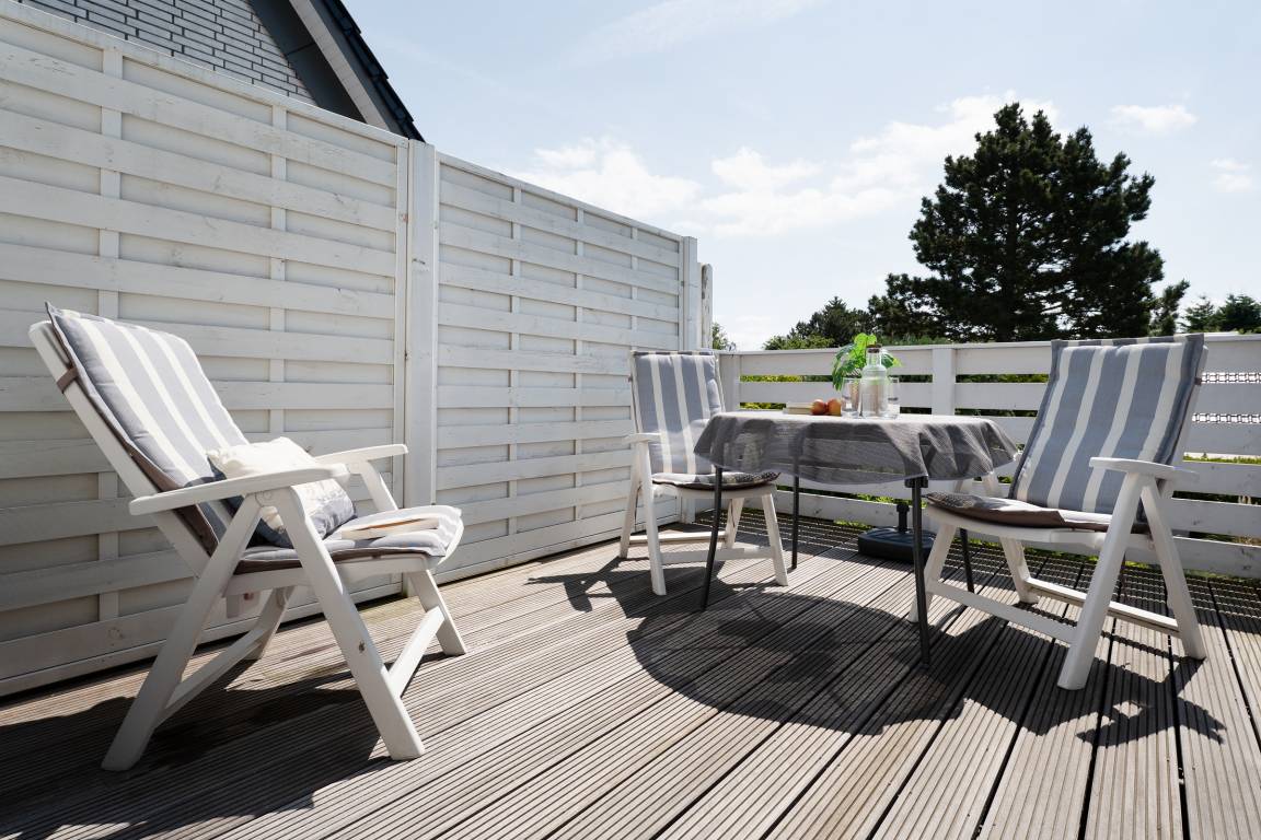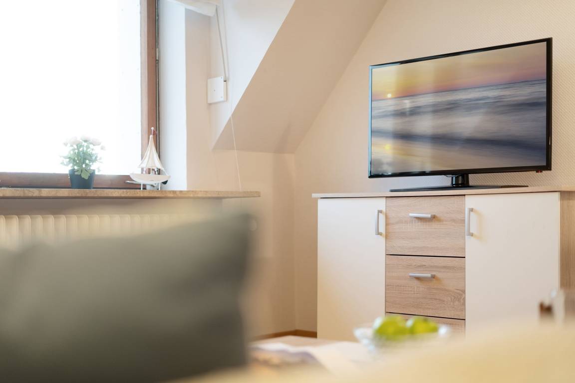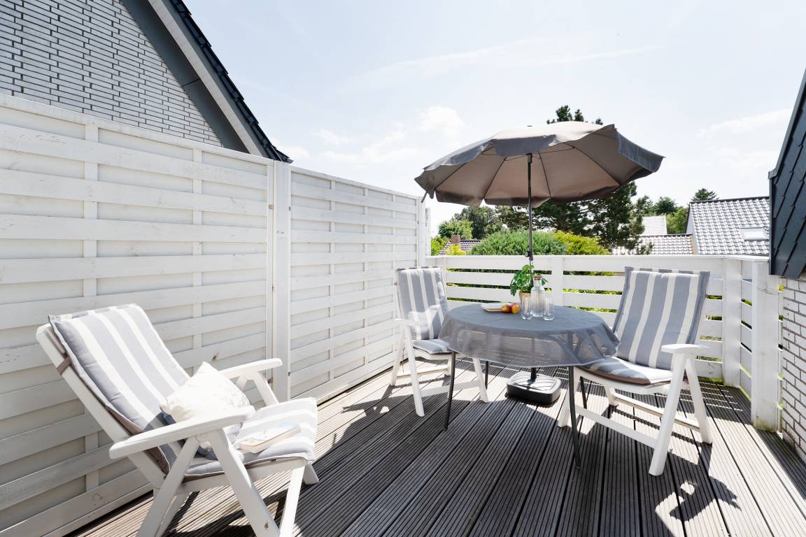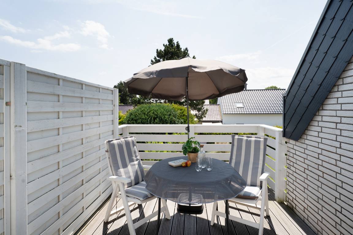 Der offen gestaltete Wohn-/Essbereich umfasst eine gemütliche Sitzecke, einen Esstisch sowie die offene Küchenzeile und begrüßt Sie lichtdurchflutet, mit gemütlicher und moderner Einrichtung. Die integrierte Küchenzeile überzeugt mit hochwertiger Ausstattung wie einem Backofen in angenehmer Arbeitshöhe sowie einer Spülmaschine. Machen Sie es sich nach langen Strandtagen auf dem großzügigen Ecksofa mit Schlaffunktion (Liegefläche 150x200cm) bequem, ein Flatscreen-TV sorgt für Unterhaltung. Vom Wohnbereich aus führt ein direkter Zugang auf die möblierte Dachterrasse mit Südostausrichtung, freuen Sie sich auf herrliche Sonnenstunden inklusive frischer Ostseeluft! Das separate Schlafzimmer ist mit einem komfortablen Boxspringbett (180x200 cm) und Kleiderschrank ausgestattet, durch Außenjalousien ist Verdunklung für die Nacht gewährleistet. Das geschmackvolle Tageslichtbad in warmen Naturtönen bietet viel Komfort.