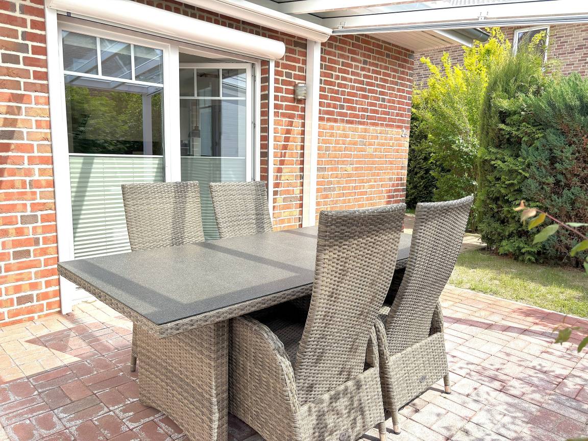 Genießen Sie entspannte Stunden auf der überdachten Südwestterrasse, die mit bequemen Möbeln, Kohlegrill bestückt ist und einen Blick auf das eingezäunte Grünstück bietet – ideal für Familien.