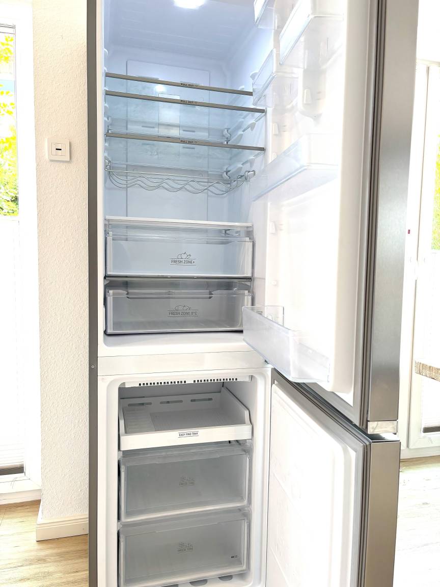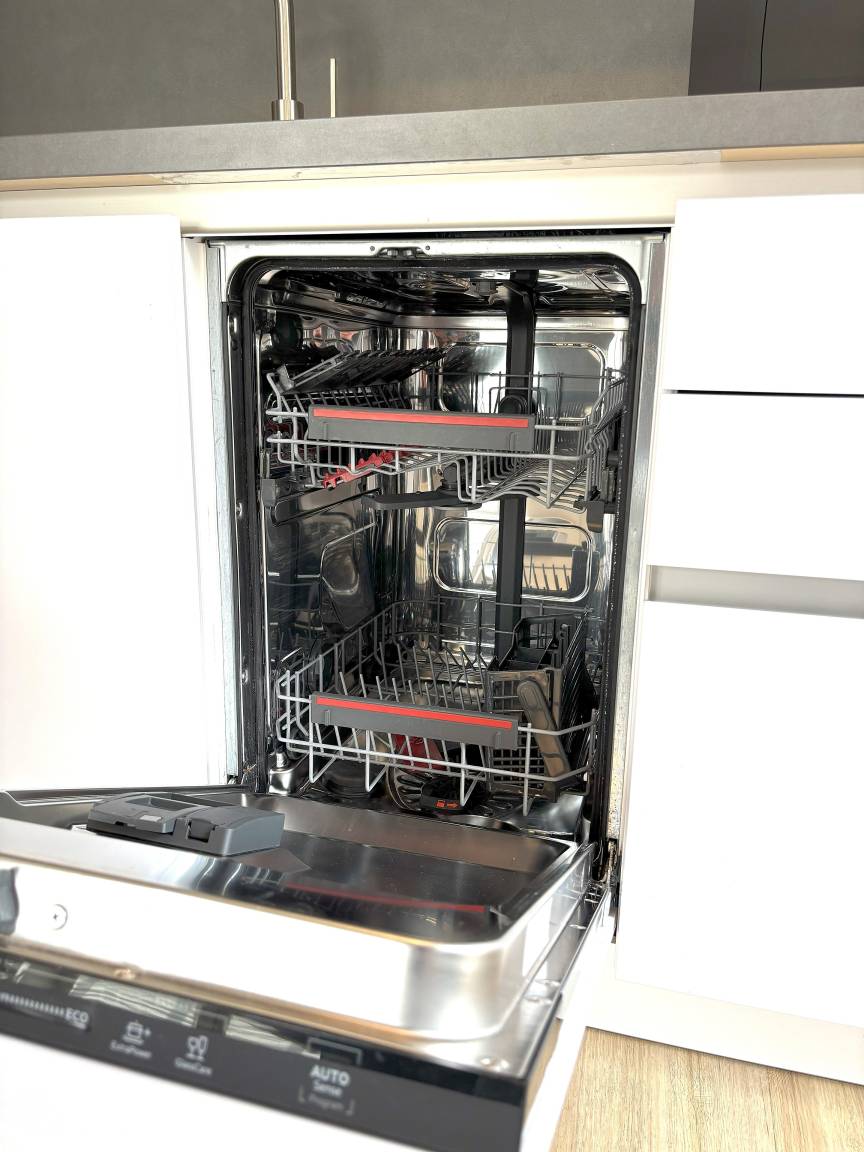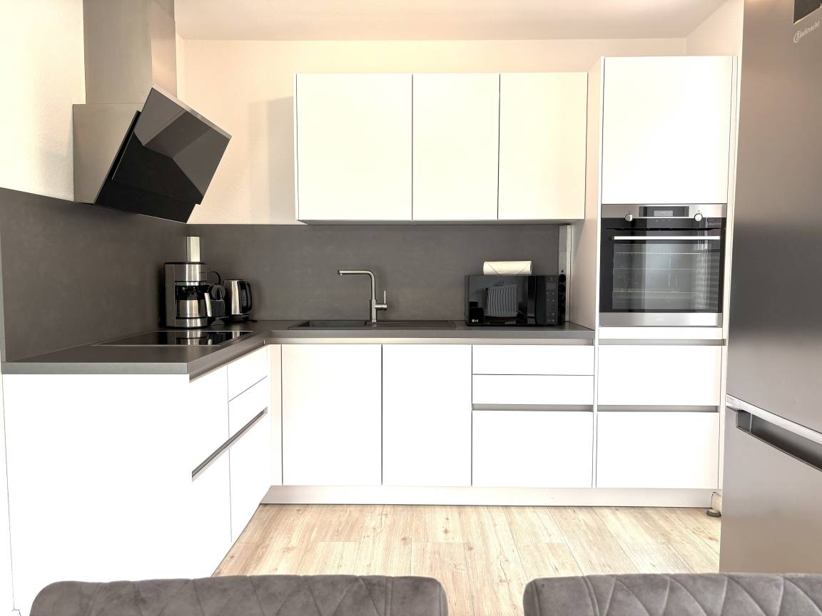 Der lichtdurchflutete Ess- und Wohnbereich lädt zum Verweilen ein und bietet einen Esstisch sowie einen gemütlichen Sofabereich mit TV. Die offene Küche ist mit modernen Geräten ausgestattet, darunter ein Backofen, Kühlschrank und Mikrowelle, und lässt keine Wünsche offen.