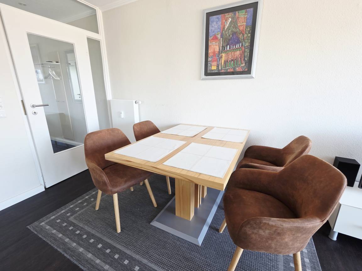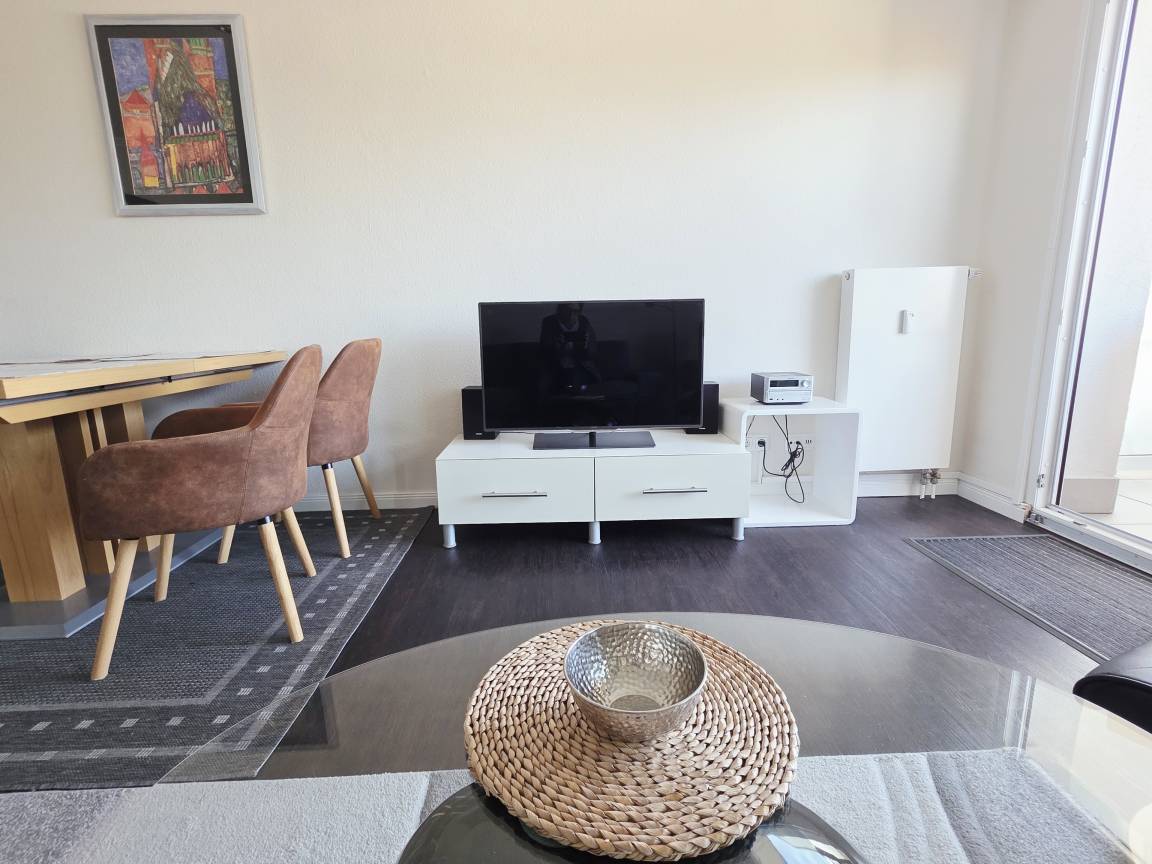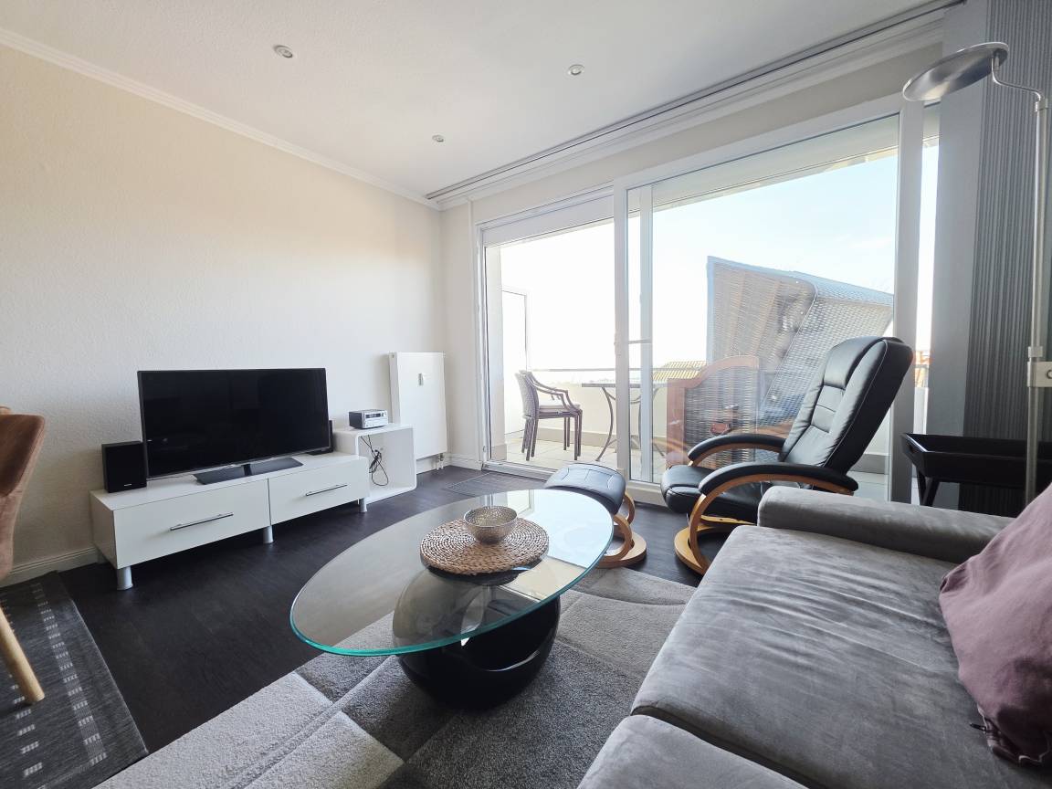 Helles, freundliches Wohnzimmer mit Couch (ausziehbar als Schlafsofa für 2 Pers.), Fernsehsessel, TV, Radio, CD sowie einem schönen Essplatz mit ungehindertem Ostseeblick & Zugang zum möblierten West-Balkon mit Strandkorb & Markise.