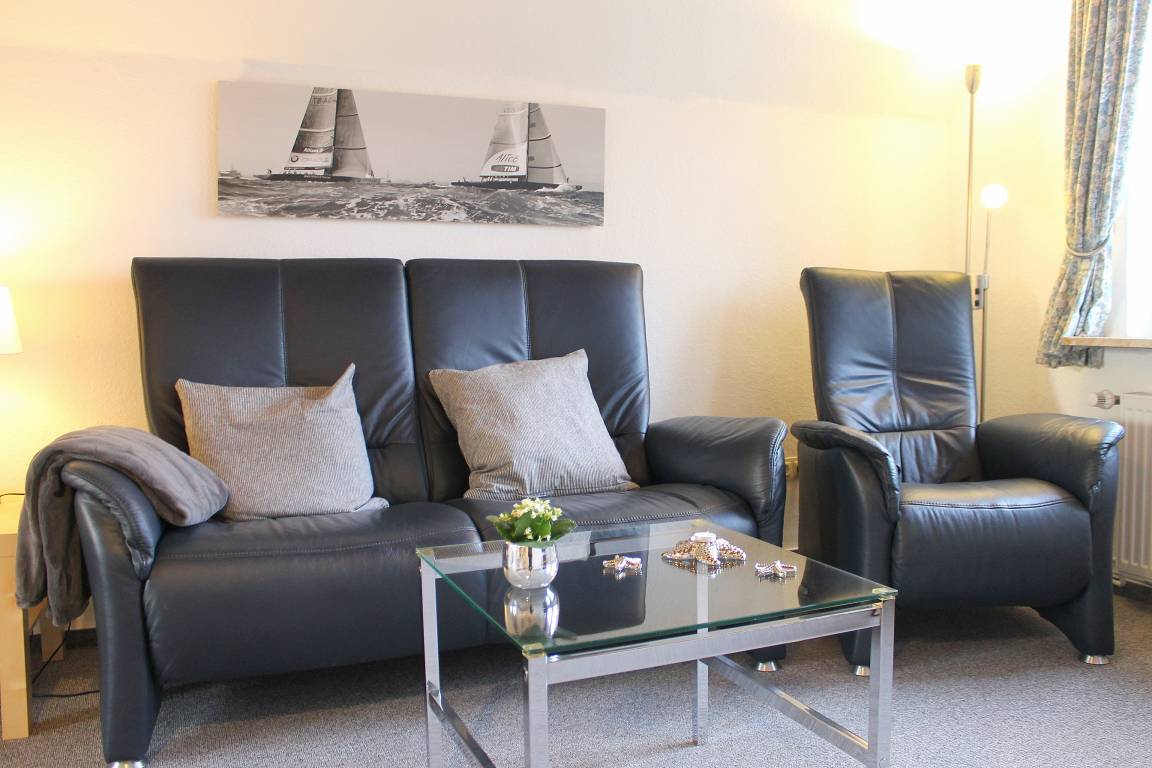 Der Wohnbereich ist mit einem 2,5-sitzigen Ledersofa, einem Relax-Fernsehsessel, einem Flachbild-TV, einer Stereoanlage mit CD sowie einem Essplatz ausgestattet.