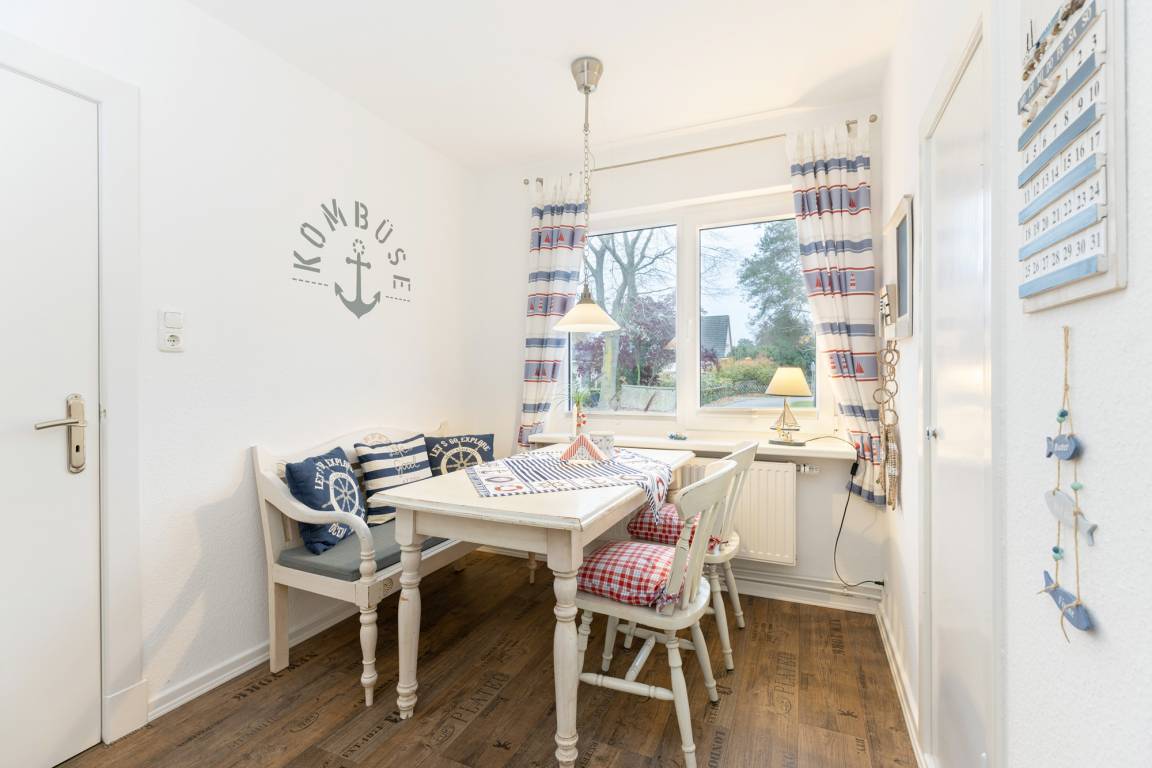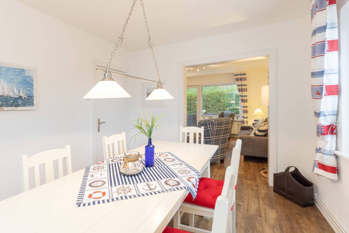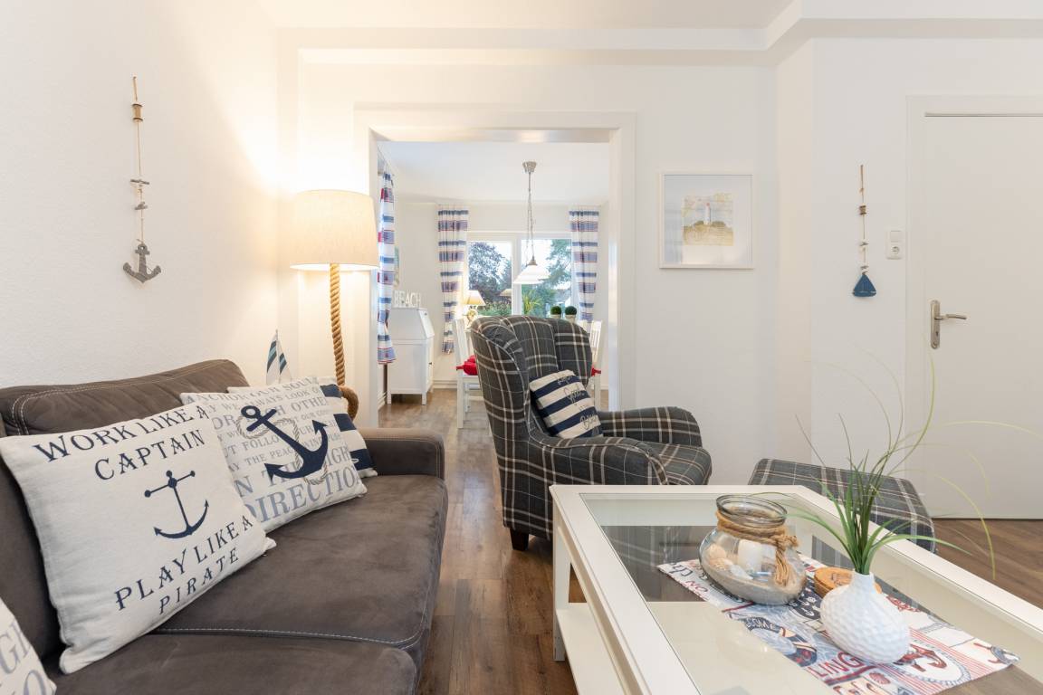 Der Wohnbereich mit angrenzendem Esszimmer versprüht Ostseefeeling pur und lädt zu entspannten Stunden nach einem ereignisreichen Urlaubstag ein.