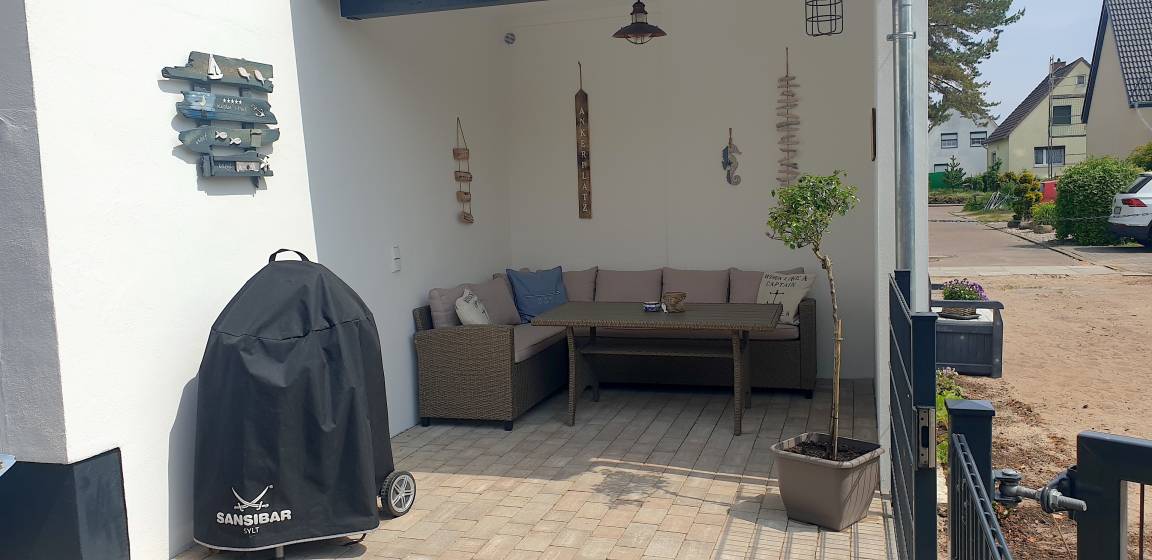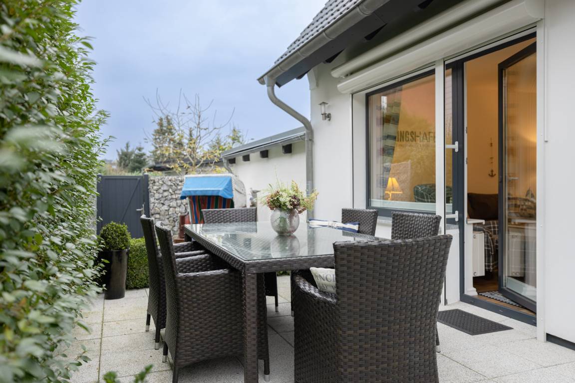Von hier hast du Zugang auf die 45 m² große Terrasse mit Süd/West-Ausrichtung, die dank Sonnenliegen, Gartenmöbeln und Strandkorb viel Auswahl zum Relaxen bietet. In 2024 wurde die Terrasse teilüberdacht (Freisitz).