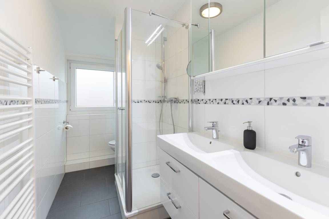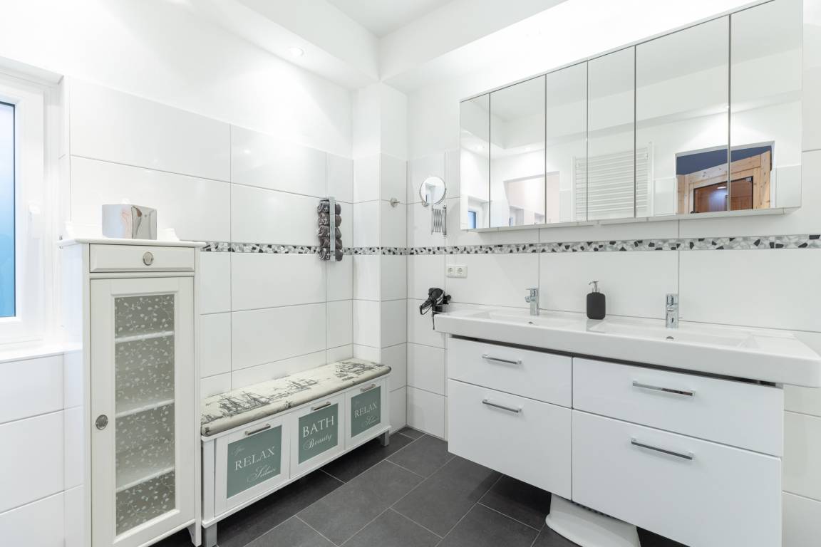 Ein weiteres Tageslichtduschbad mit Doppelwaschtisch sorgt im Obergeschoss für einen entschleunigten Start in den Tag.