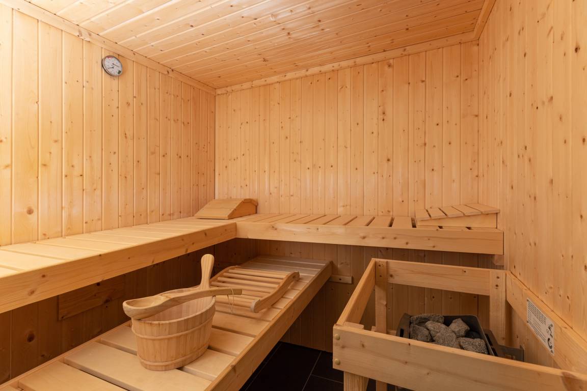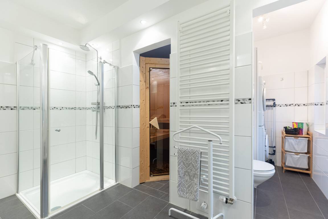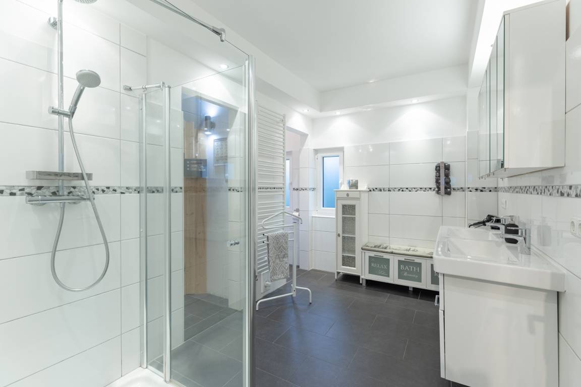 Im Erdgeschoss befindet sich ein modernes Tageslichtbad mit Walk-in-Dusche und Doppelwaschtisch. Eine Sauna macht dieses Feriendomizil auch in der kalten Jahreszeit zu einem tollen Reiseziel.