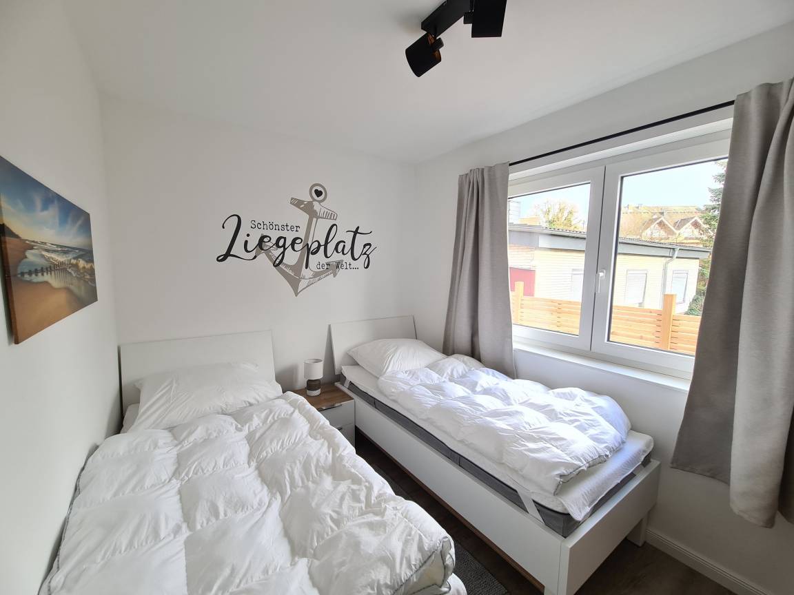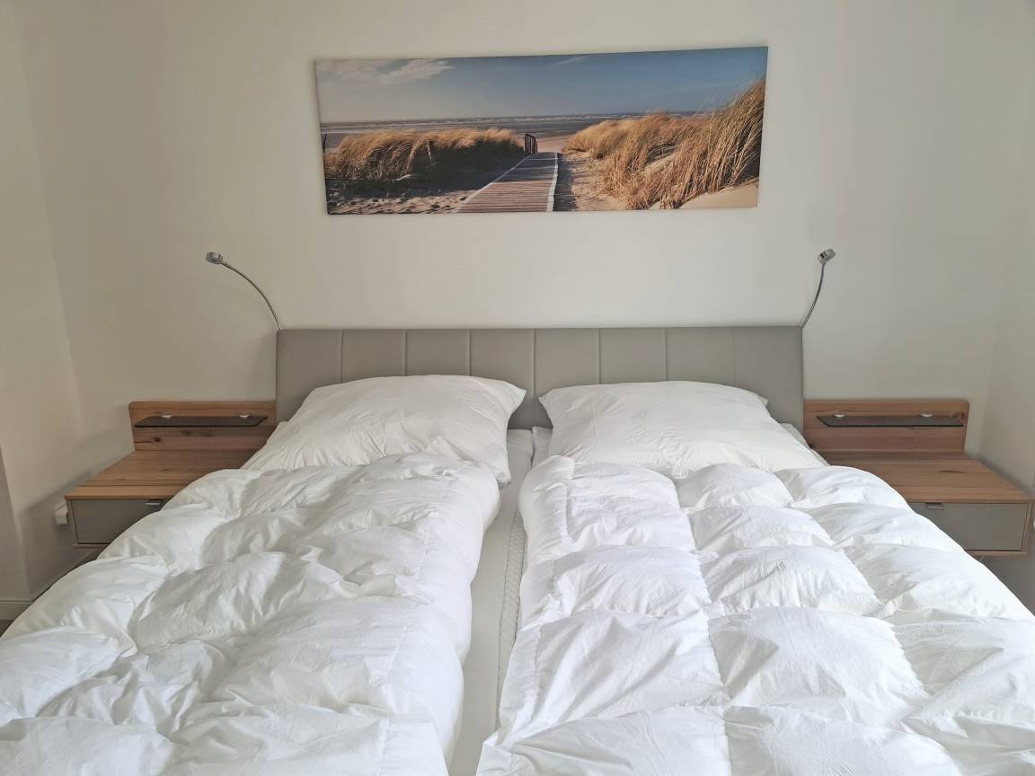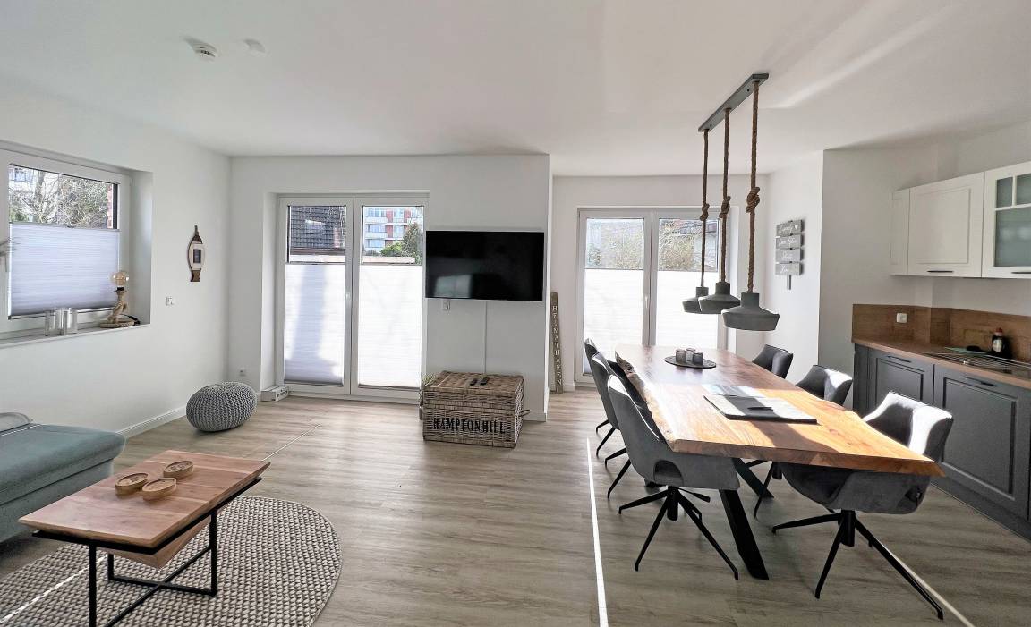 Die hervorragende Lage (zentral und doch ruhig gelegen; Ihre Ferienwohnung befindet sich im hinteren Bereich) und hochwertige Einrichtung machen diese 3-Zimmer Ferienwohnung zu einem ganz speziellen Hotspot. Die Ferienwohnung liegt im Erdgeschoss; sie ist behindertenfreundlich angelegt. Ein stufenfreier Zugang ermöglicht ein bequemes Betreten der Wohnung. Der Wohnbereich begrüßt Sie hell und lichtdurchflutet mit einer herrlich großen Fensterfront und direktem Terrassenzugang. Eine Schlafcouch bietet Schlafgelegenheit für bis zu 2 Personen. Zu Ihrer Unterhaltung steht Ihnen ein LED- SMART TV zur Verfügung. Die moderne, sehr gut ausgestattete Küche ist offen gestaltet und perfekt in den Wohnraum integriert. Der angrenzende Essplatz ist für bis zu 6 Personen ausgerichtet. Entspannen Sie sorglos nach Ihrem Strandtag in einem der beiden separaten Schlafzimmer mit komfortablen Doppelbett (90x200 cm, von hier aus Zugang zum 1. Duschbad/WC). Das 2. Schlafzimmer bietet zwei Einzelbetten (90x200 cm). Ein weiteres Duschbad geht vom Flur ab; das 3. Duschbad befindet sich im unteren Bereich. Alle Bäder verfügen über walk-in-Duschen, Waschtische, Handtuchheizungen sowie beleuchtete Schminkspiegel. Ein besonderes Highlight ist die Sauna mit Ruheraum im unteren Bereich. Die Treppe ist mit einem Treppenschutzgitter versehen. Genießen Sie hier entspannende Stunden in Ihrem wohlverdienten Urlaub.