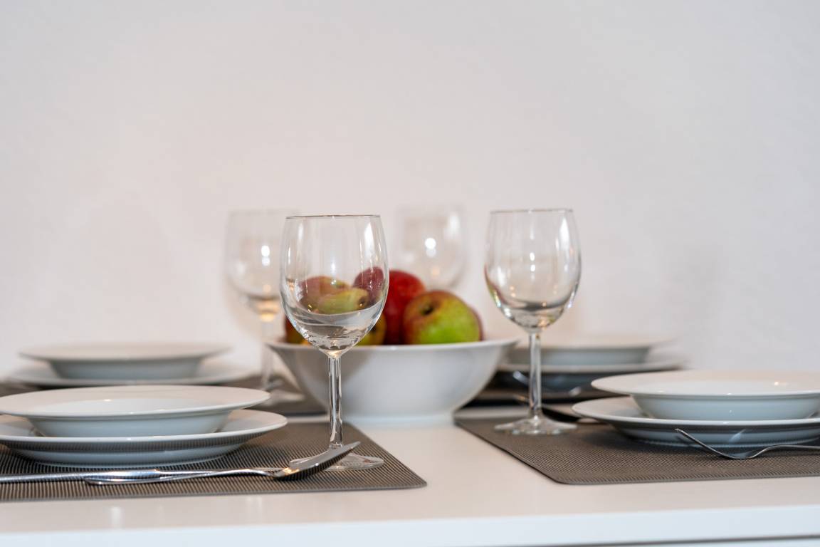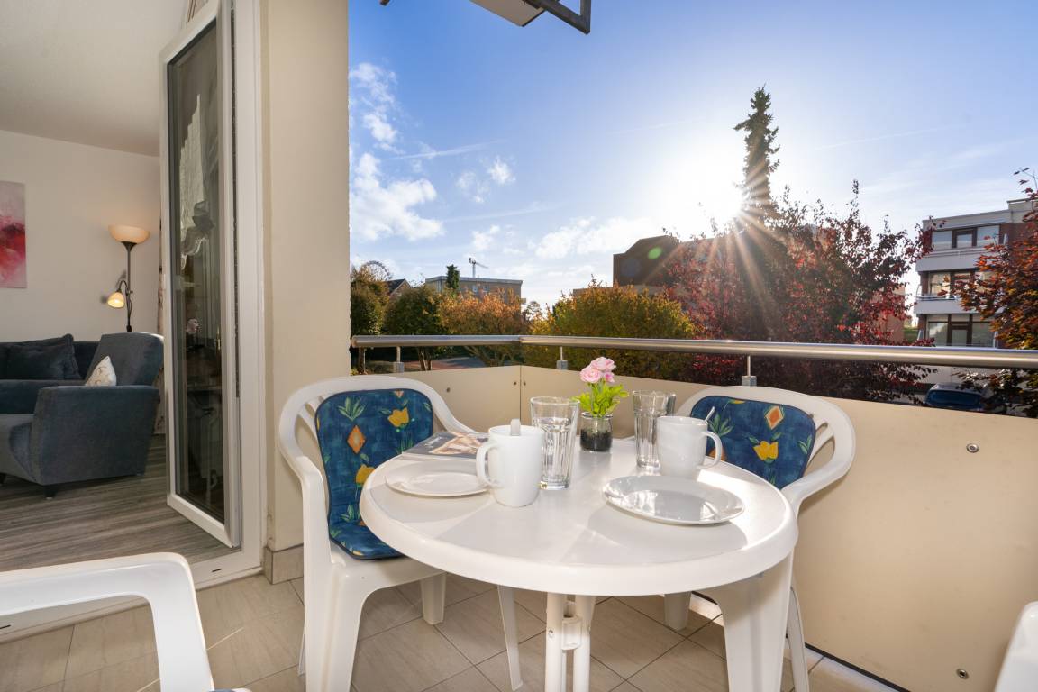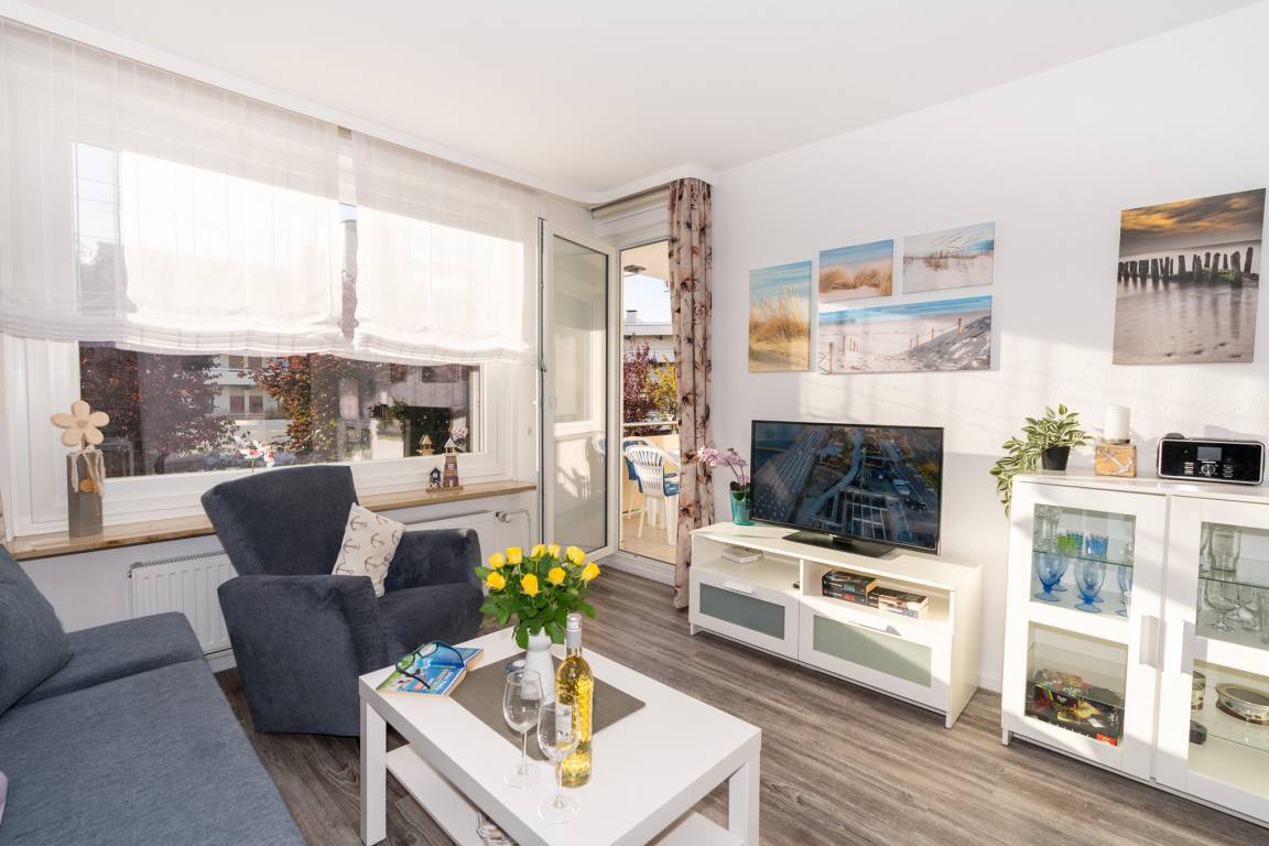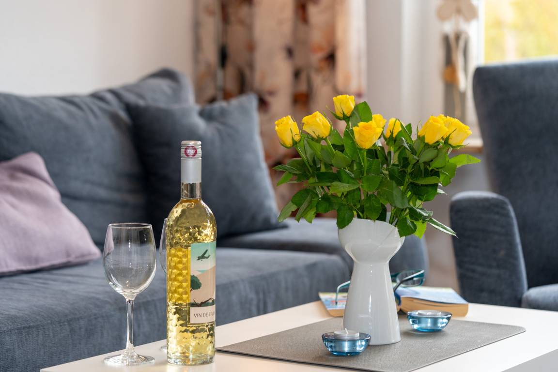 Der helle Wohnbereich bietet Ihnen nicht nur eine Couch-Ecke mit neuwertigem Schlafsofa und TV, sondern auch einen Essbereich für bis zu 4 Personen. Den sonnigen Süd-Balkon erreichen Sie ebenfalls über das Wohnzimmer. Ausgestattet mit einem Tisch und vier Stühlen, lässt sich hier hervorragend der Tag ausklingen. Kostenloses W-Lan steht Ihnen selbstverständlich zur Verfügung.