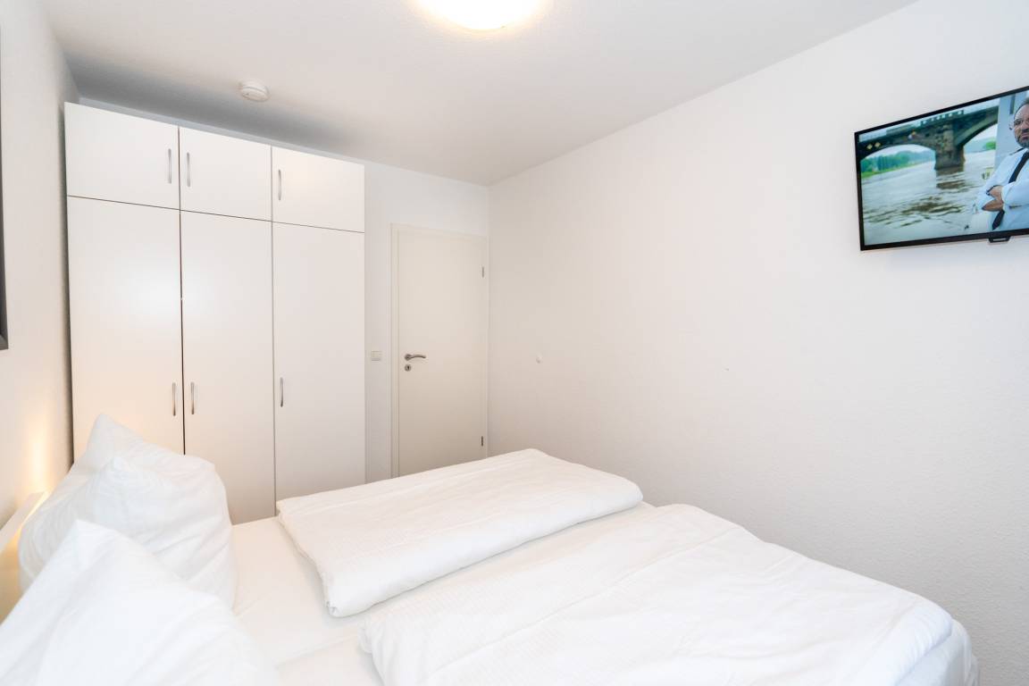Das Schlafzimmer ist mit einem bequemen Doppelbett, einem Kleiderschrank, Nachttischen und einem zusätzlichen Flat-TV ausgestattet. Weitere Schlafplätze bietet die Schlafcouch im Wohnzimmer.