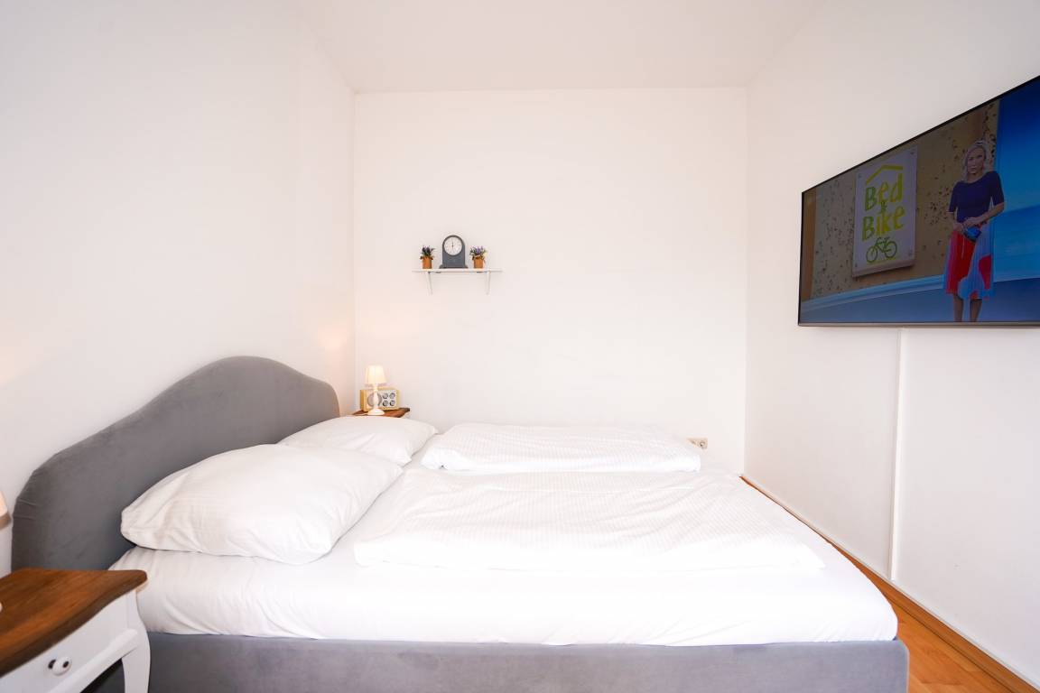 Zwei Schlafzimmer mit jeweils einem großen Doppelbett (180 x 200 cm) und geräumigen Kleiderschränken bieten ausreichend Platz. Zusätzlich verfügen beide Schlafzimmer über einen Fernseher. Der Südbalkon kann über das Wohnzimmer und über ein Schlafzimmer betreten werden. Den zweiten, überdachten und nach Westen ausgerichteten Balkon erreichen Sie über das zweite Schlafzimmer. Tische und Stühle stehen auf beiden Balkonen zur Verfügung und laden zum Verweilen und Entspannen ein.