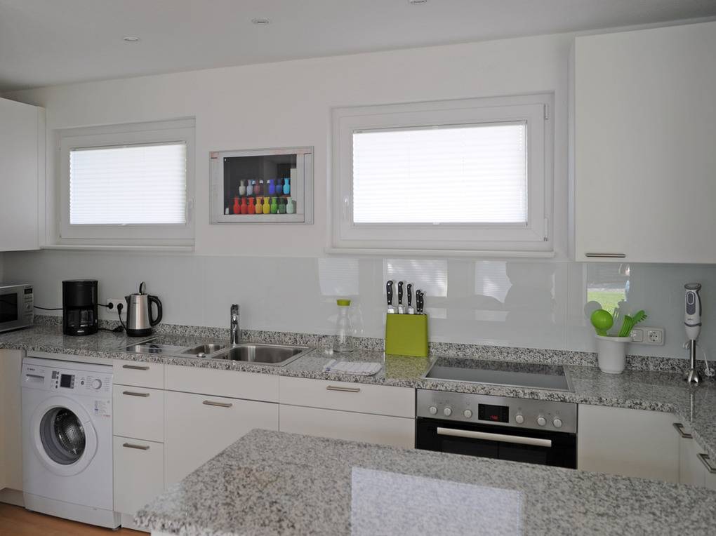Der offene Küchenbereich öffnet sich hinter einer Theke. Hier befinden sich ein integrierter Elektroherd (4 Ceran-Felder) mit Backofen, eine Mikrowelle, eine Geschirrspülmaschine (60 cm breit), eine Waschmaschine und ein geräumiger Kühlschrank mit 3 ***+ Gefrierfach. Zur Küchenausstattung gehören ein Toaster, Wasserkocher, Eierkocher, Handmixer, Stabmixer, ein Messerblock mit guten Stahlmessern, Salz- sowie Pfeffermühle ebenso wie Edelstahltöpfe, Pfannen, Geschirr, Besteck und viele weitere Hilfsmittel. Alles ist mit viel Liebe ausgewählt, umfassend, praktisch und stammt von namhaften, erstklassigen Herstellern.