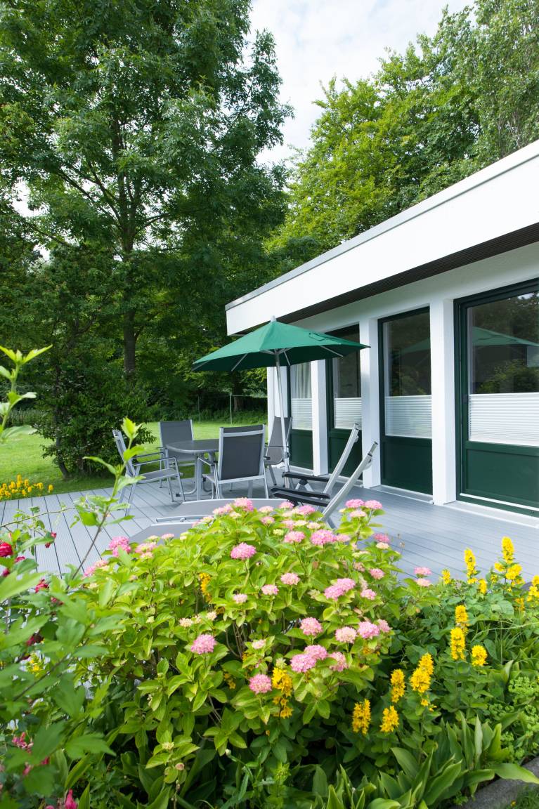 Die Terrasse auf der Südwestseite liegt bis zum Abend im sonnenbeschienenen Bereich. In einem abschließbaren Schuppen befinden sich 4 Gartenstühle, 1 Tisch und 2 bequeme Liegestühle. Der Sonnenschirm schützt vor zu starker Sonneneinstrahlung.