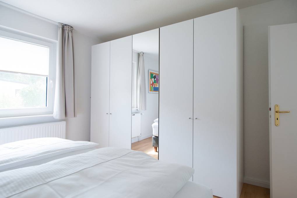 Das ebenfalls vom Flur aus zugänglichem Schlafzimmer (ca. 15 qm) bietet ein großes Doppelbett mit Nachttischen und einen geräumigen Kleiderschrank von 2,50 m Breite mit großem Spiegel.