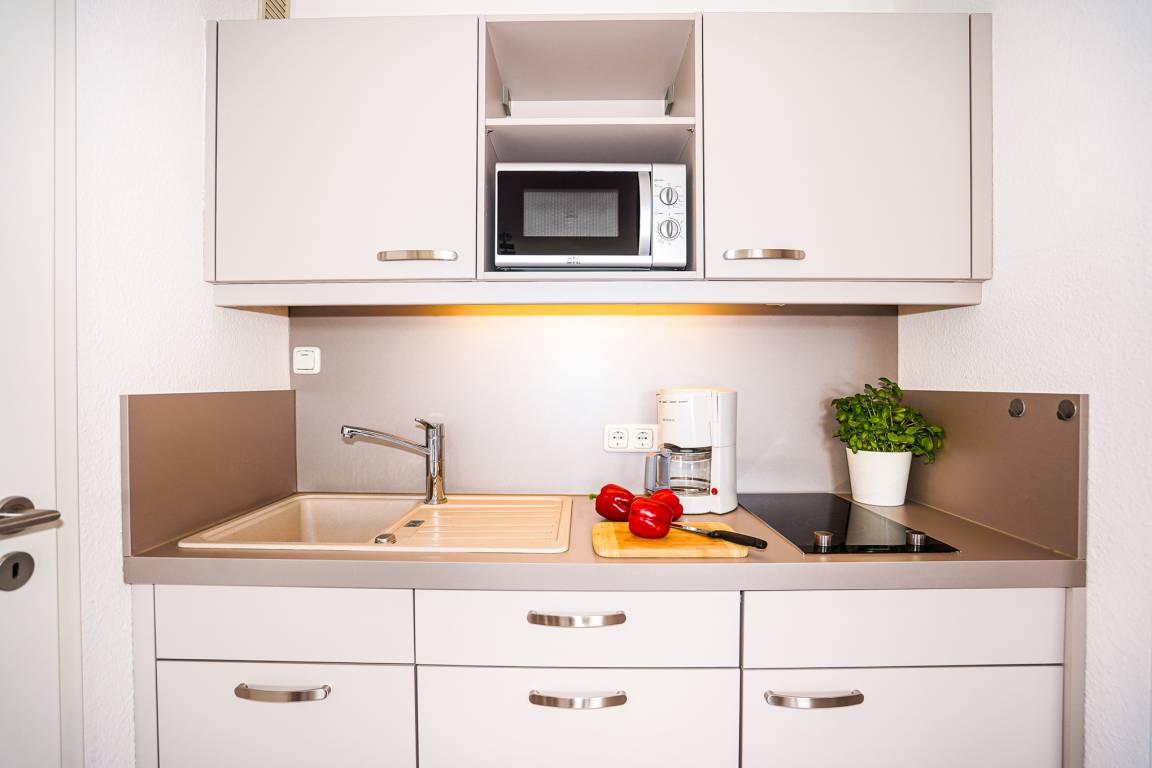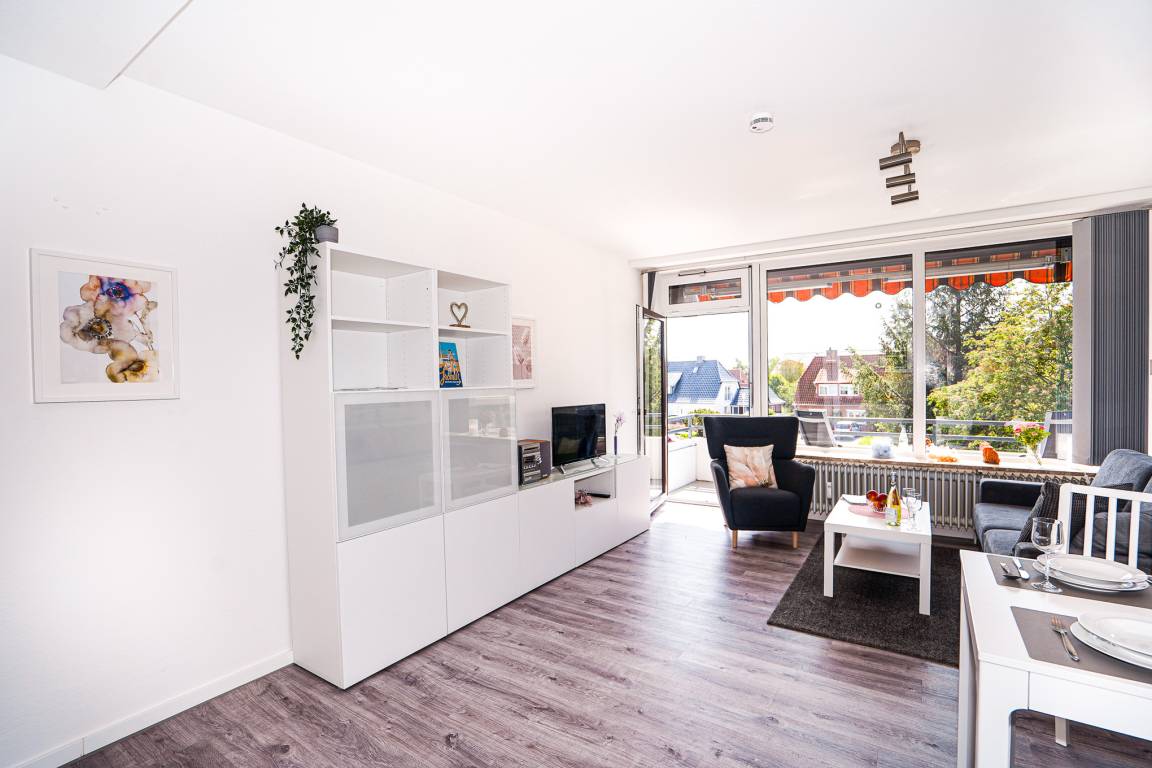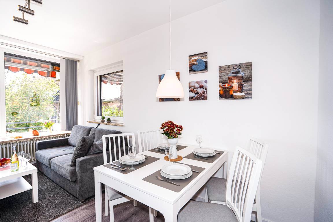 Den Mittelpunkt der Wohnung bildet der lichtdurchflutete, kombinierte Wohn-/Essbereich mit direktem Balkonzugang. Hier lässt es sich auf dem Sofa auch an Regentagen gemütlich machen. Ein Fernseher, Stereoanlage und selbstverständlich kostenloses W-LAN sorgen für Unterhaltung. Das Sofa lässt sich abends bei Bedarf mit wenigen Handgriffen leicht in eine Schlafstätte (150x200)