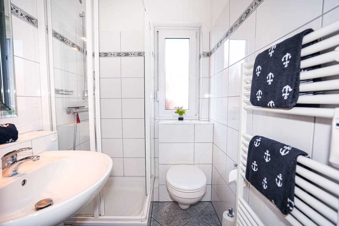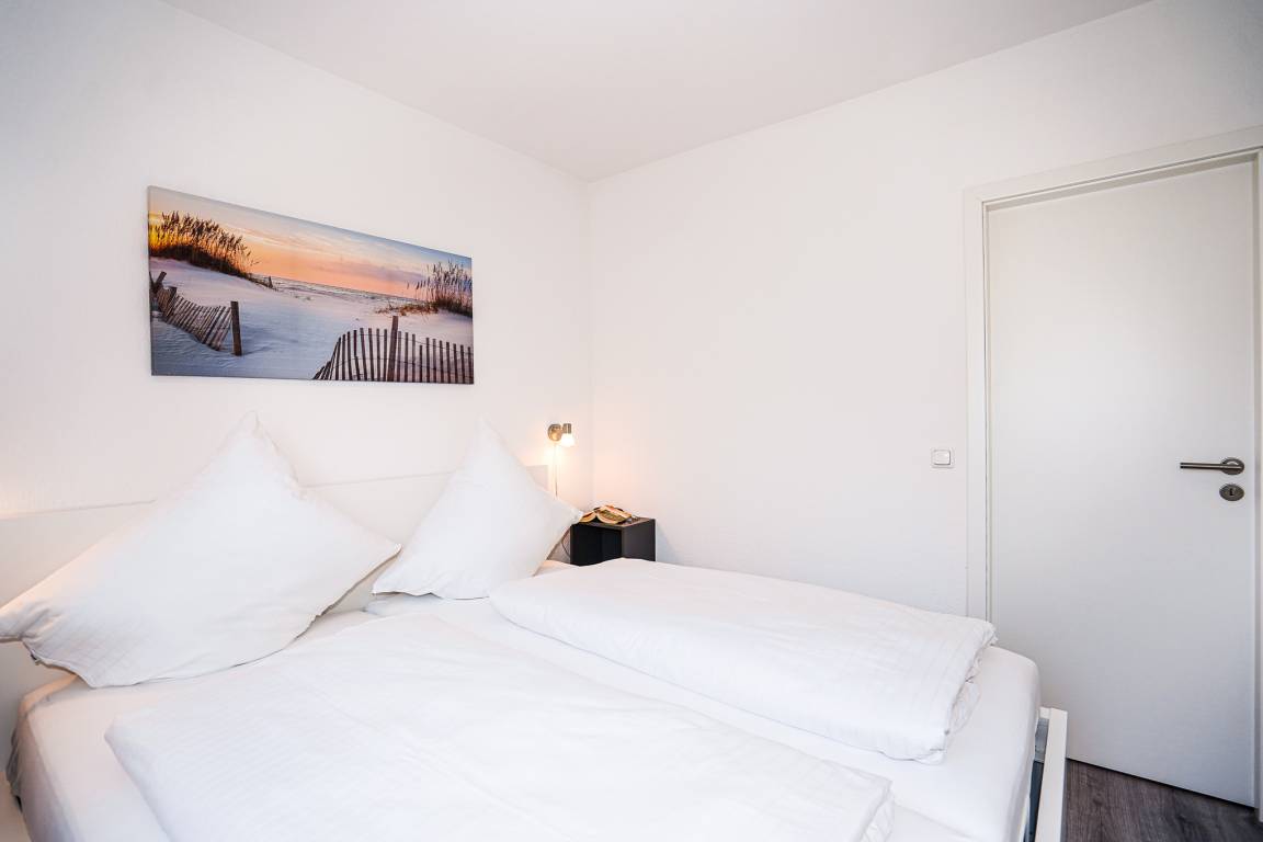 Im Schlafzimmer, welches mit einem bequemen Doppelbett ausgestattet ist, befinden sich große Kleiderschränke mit ausreichend Staumöglichkeit für Ihre Urlaubskleidung. Das Tageslichtbadezimmer ist hell gefliest und mit einer Dusche, WC sowie Handtuchheizkörper ausgestattet.