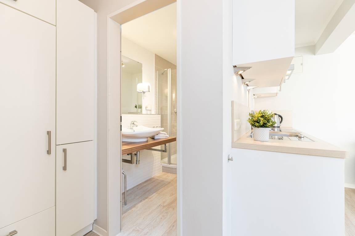 Versteckt, hinter einem weißen Lamellenzaun, liegt die ca. 9 qm große Terrasse mit Holzboden und Markise, über die Sie das ruhig gelegene Apartment für 2-3 Personen erreichen.