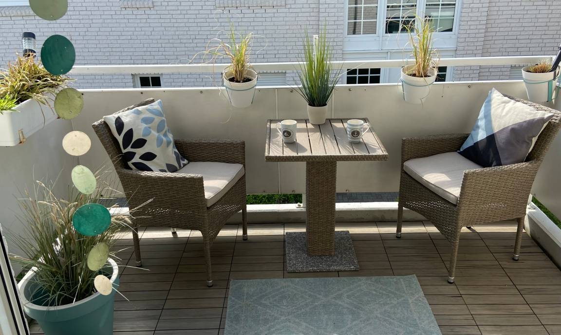 Durch eine Doppel-Flügeltür gelangt man auf den sonnigen Süd-West-Balkon mit Tisch und Stühlen.