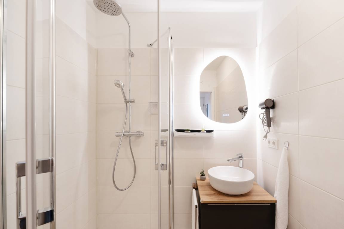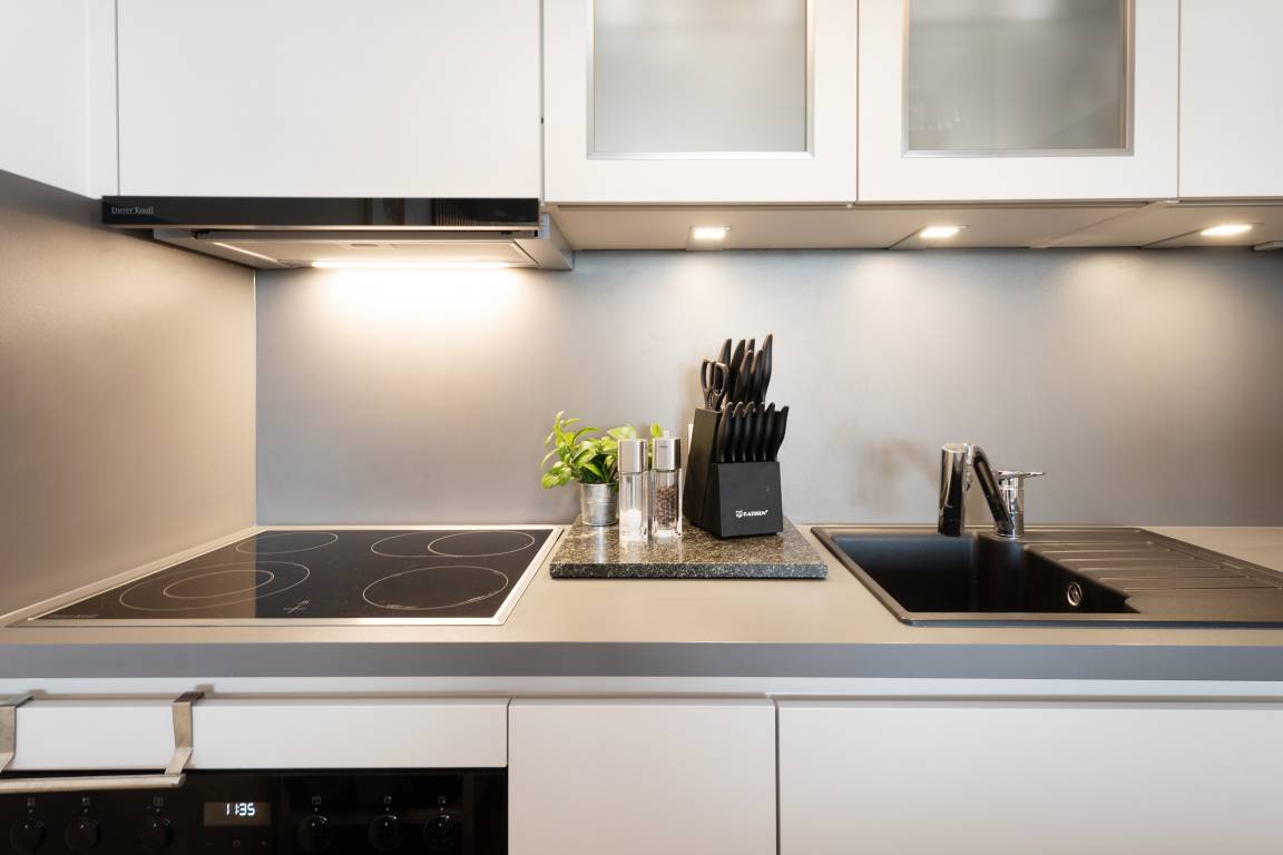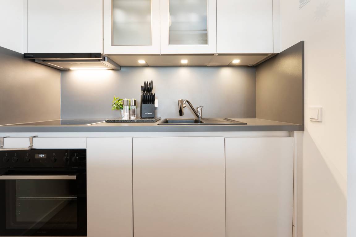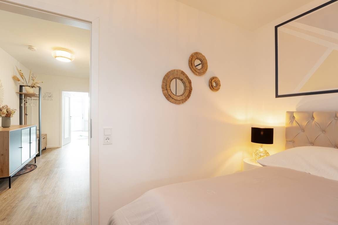 Die angrenzende Küche ist vollständig ausgestattet und ideal für die Selbstversorgung. Ein Essbereich lädt zu gemeinsamen Mahlzeiten ein. Das Schlafzimmer bietet ein komfortables Doppelbett und ausreichend Stauraum. Das moderne Bad verfügt über Dusche, WC, Kosmetikspiegel und Haartrockner. Eine Gemeinschaftssauna steht gegen Aufpreis zur Verfügung. Waschmaschine und Trockner mit Münzeinwurf befinden sich im Wäschekeller.