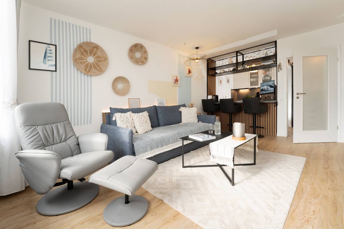 Der lichtdurchflutete Wohnbereich bietet ein komfortables Sofa, einen Smart-TV, sowie einen Zugang zum Balkon, der mit Möbeln ausgestattet ist und zum Verweilen an der frischen Ostseeluft einlädt. Hier können Sie den Tag mit einem Kaffee beginnen oder abends die laue Brise genießen. Für spielerische Abende steht eine Xbox zur Verfügung.