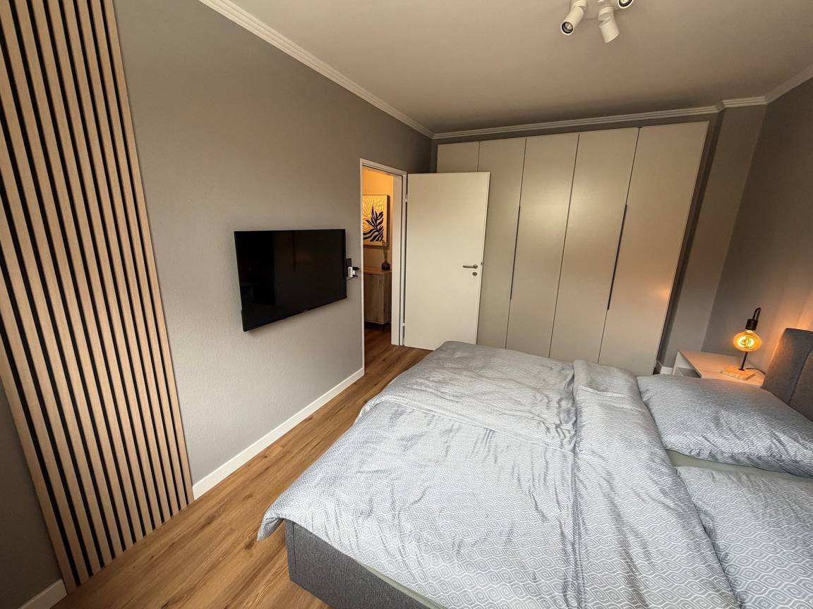 Geräumiges Schlafzimmer (neu 2026) mit Doppelbett (2x90x200cm) und 5-türigem Kleiderschrank. Ein Smart-TV ist vorhanden. Das Fenster lässt sich durch einen Vorhang verdunkeln und ist zusätzlich mit einem Plissee versehen.