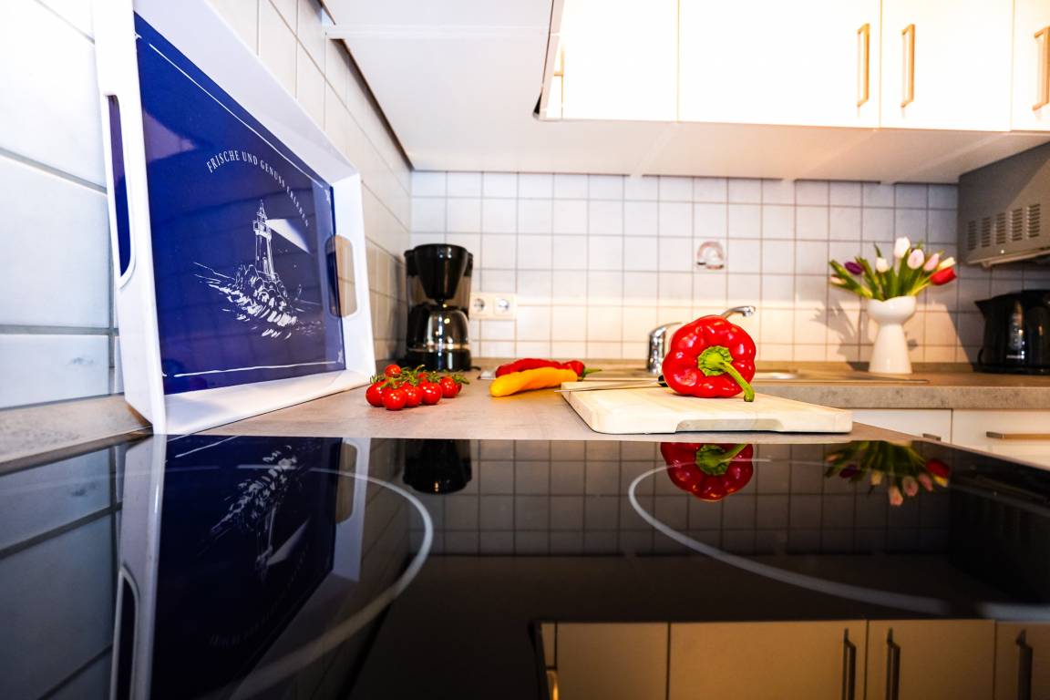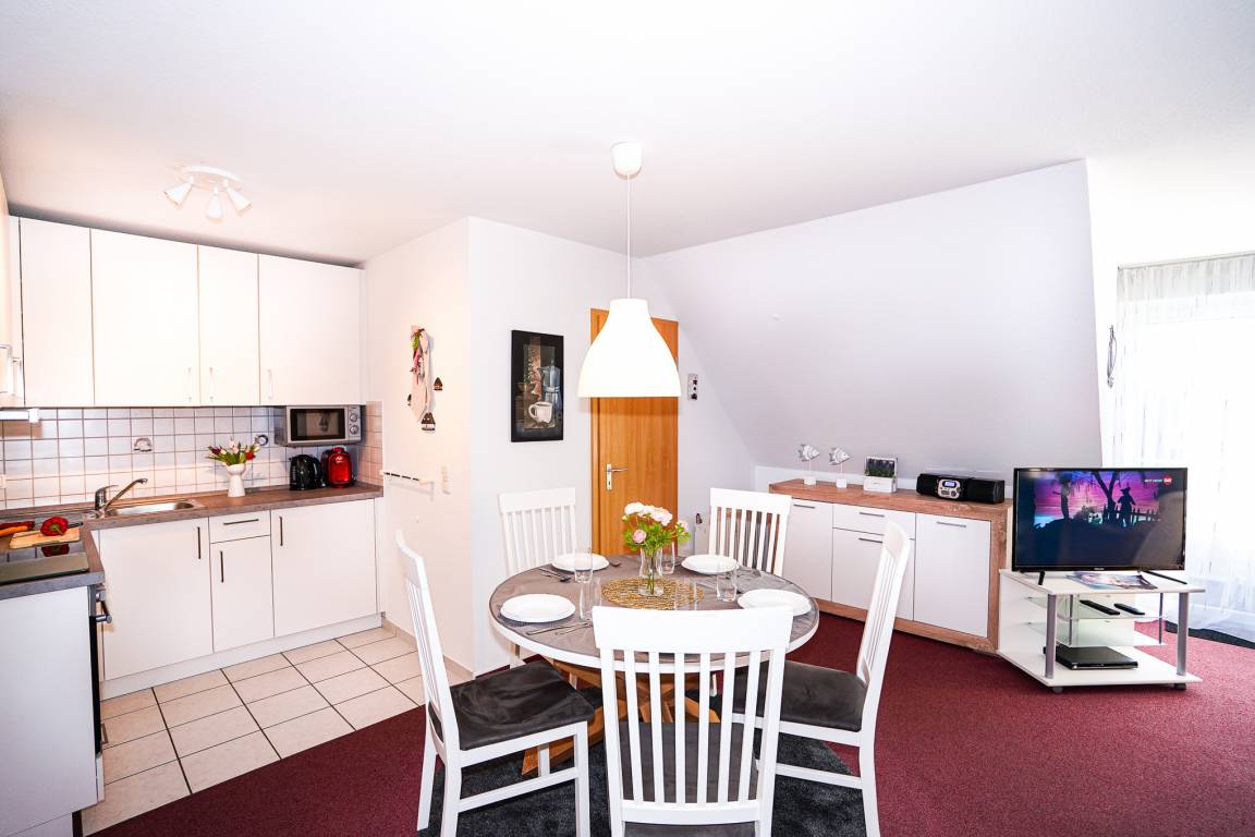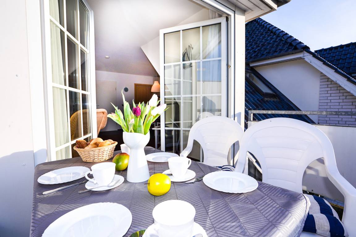 Der Wohnbereich ist mit einem großen Sofa, Sessel und Fernseher ausgestattet. Die Küche verfügt über einen Backofen, Ceranfeld, Spülmaschine, Kühlschrank mit Gefrierfach, Mikrowelle und diverse Elektrokleingeräte. Ergänzt wird der Wohnbereich um einen Esstisch mit vier Stühlen. Von hier aus betreten Sie den Balkon in Süd-West-Ausrichtung. Entspannen Sie hier nach einem ausgiebigen Tag am Strand.