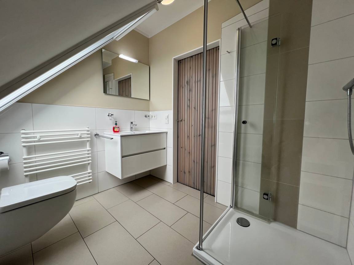 Dieses kleine gemütliche Appartement befindet sich im Dachgeschoss. Übergroße Dachflächenfenster geben einen traumhaften Blick über Grömitz. Diese Wohnung ist besonders geeignet für junge Leute. Der Wohn-/Essbereich ist mit einem Esstisch und 4 Stühlen sowie einer hochwertigen Wohn/Schlafcouch (Liegefläche 160cm x 190cm) für zwei Personen ausgestattet. Die offene Küche, ein kleiner Schlafraum (Liegefläche 160cm x 190cm?) sowie ein Badezimmer sind unter den Dachschrägen des Spitzdaches.
