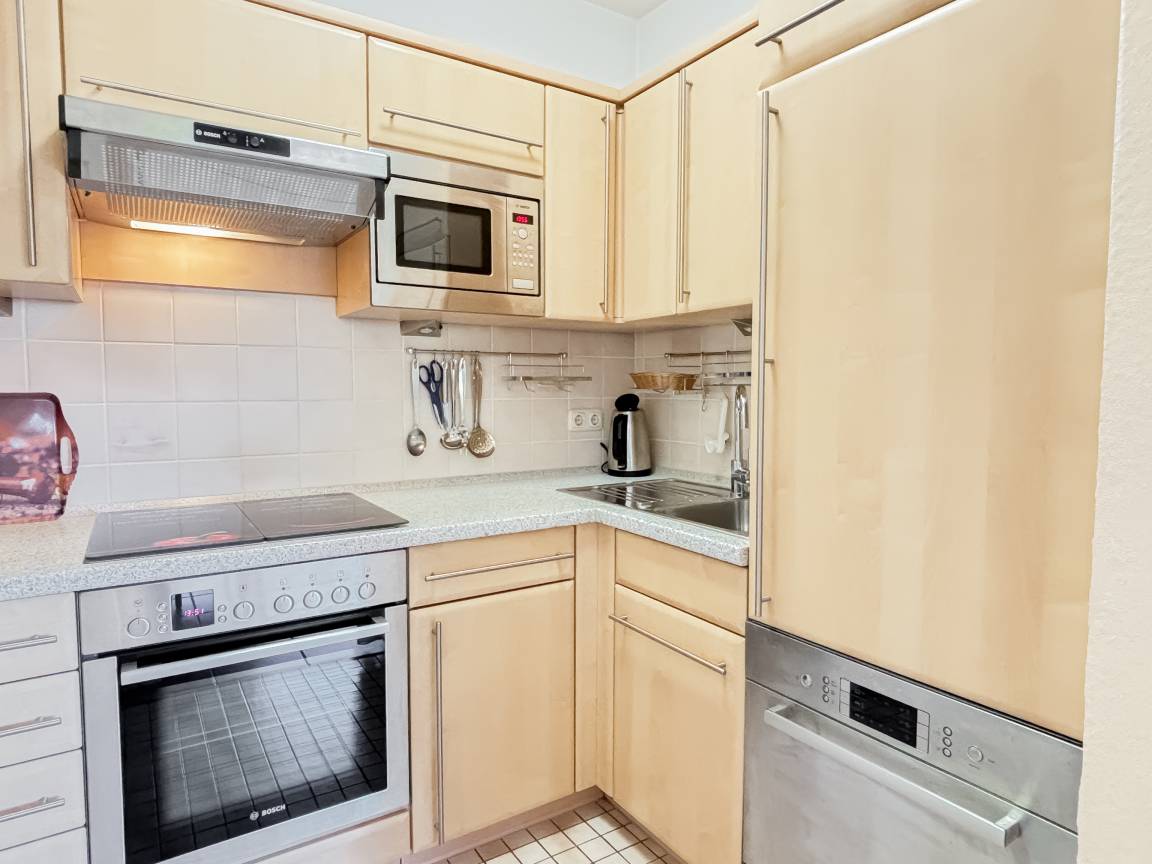 Die Küche ist mit E-Herd- Cerankochfeld + Backofen, Mikrowelle, Kühlschrank mit Gefrierfach, Geschirrspüler und den üblichen Küchengeräten sehr gut ausgestattet.