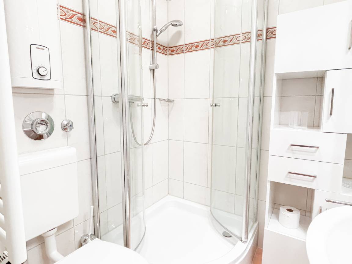 Helles Bad mit Duschkabine, WC und Waschtisch.