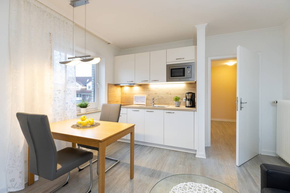 Die Küche ist neben einem Kühlschrank mit Eisfach auch mit einer Mikrowelle, einem Ceran-Kochfeld, einer Filterkaffeemaschine und einem Wasserkocher ausgestattet.
