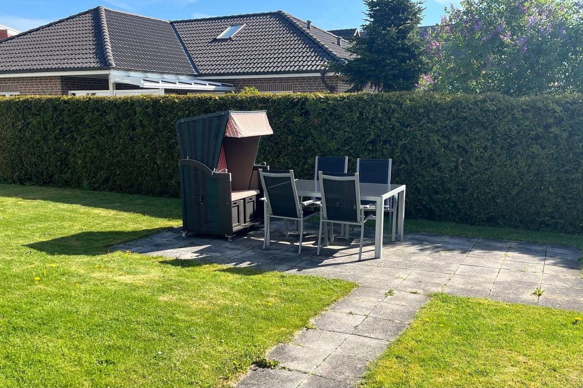 PKW-Stellplatz vor dem Gebäude. Kostenloses W-Lan (Hochgeschwindigkeits-Internetanschluss über Kabel). Zu der Wohnung gehört ein Teil des Gartens, der sich vor dem Haus befindet in südlicher Richtung, ausgestattet mit Gartenstühlen, Tisch und Strandkorb.