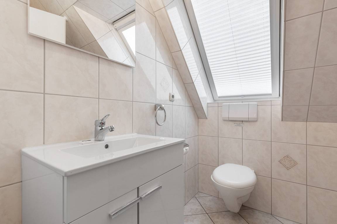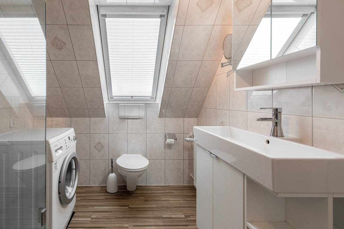 Modernes, hell gefliestes Tageslichtbad mit Dusche, WC und Waschbecken. Eine Waschmaschine steht zur kostenlosen Nutzung bereit. Separate, zusätzliche Toilette mit Fenster.