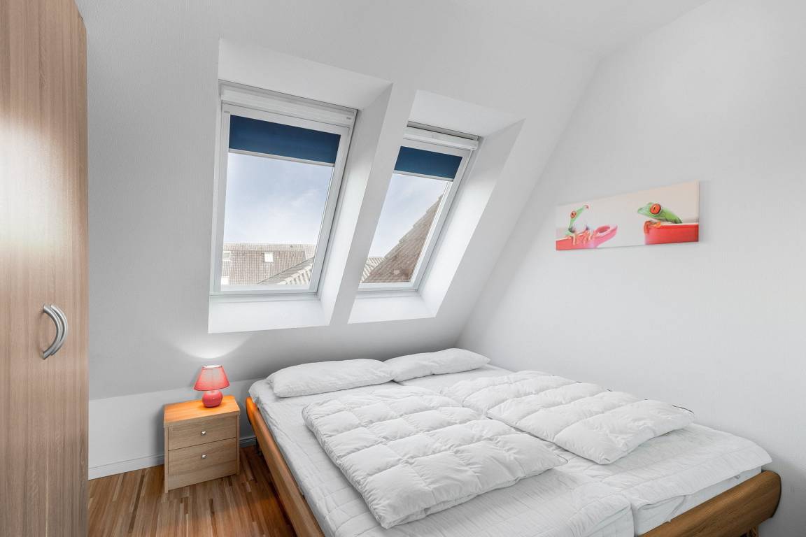 Separates, modern ausgestattetes 2. Schlafzimmer mit einem Doppelbett (2x 80x200cm), einem Nachttisch und einem 2-türigem Kleiderschrank ausgestattet. Die Fenster lassen sich durch Innenrollos blickdicht verdunkeln. Das Zimmer ist mit Designer-Planken ausgelegt.
