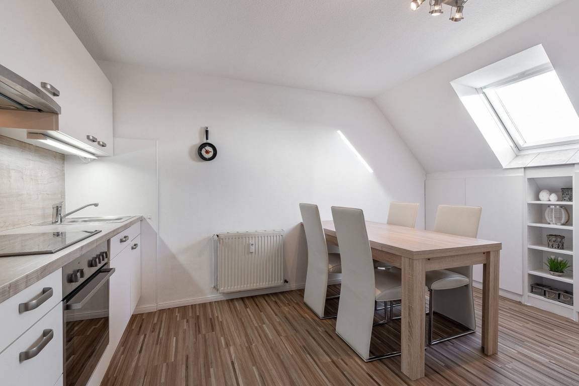 Moderne, komplett ausgestattete Wohnküche mit einem Essplatz für 4 Personen. Die Küche ist mit einem 4-Platten Cerankochfeld, einem Backofen, einer Spülmaschine, einem Kühlschrank mit kleinem 3-Sterne Gefrierfach, einem Toaster, einem Wasserkocher und einer Kaffeemaschine ausgestattet.