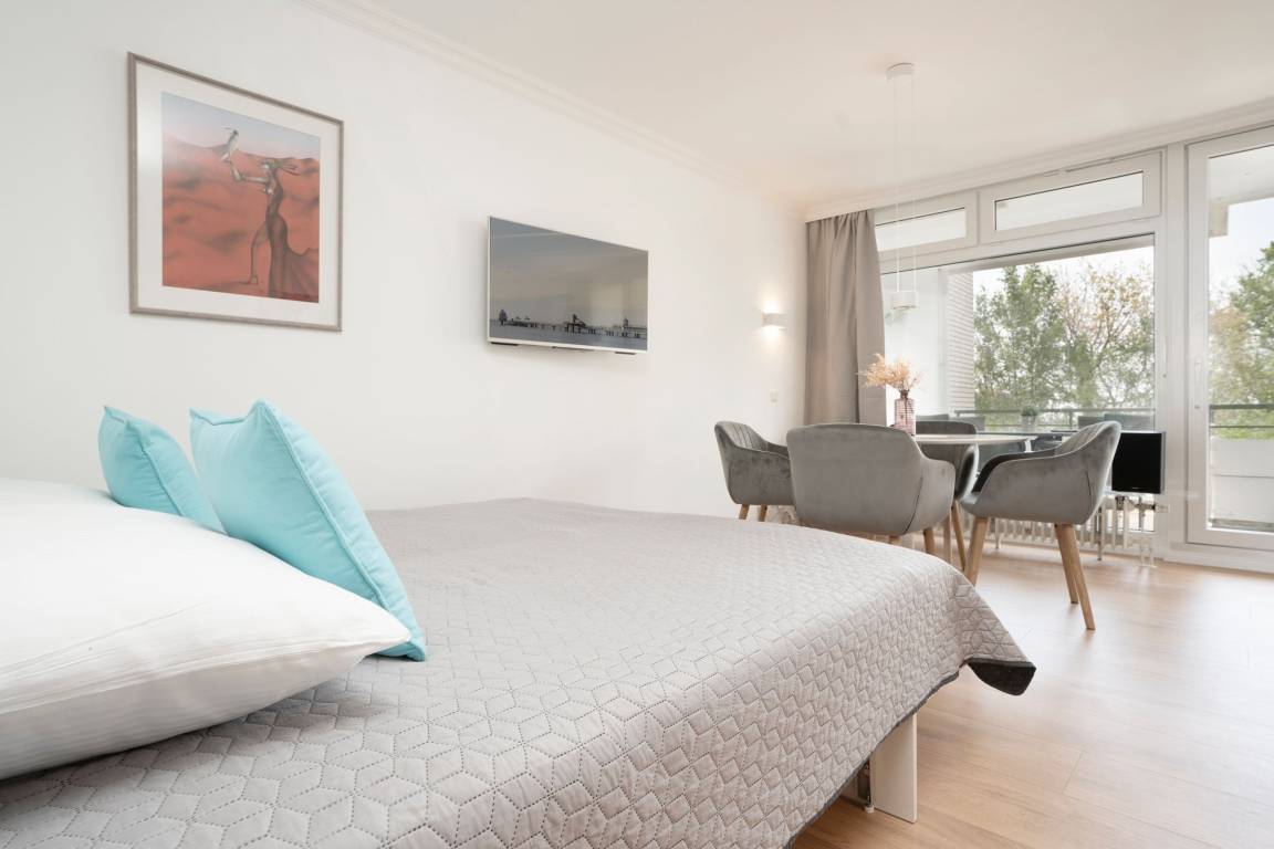 Aus dem 5. Stock können Sie Ihren Blick vom möblierten, überdachten Balkon aus über die Dächer der Anlage hinweg auf das davorliegende Meer schweifen lassen. Eine große Fensterfront trennt den Balkon vom Wohnbereich Ihres Feriendomizils ab, in dem Sie es sich am Essplatz oder auf der großen Schlafcouch (2x 90x200 cm) gemütlich machen können. Das separate Schlafzimmer ist mit einem bequemen Boxspringbett (180x200cm) ausgestattet. Ihre Urlaubsgarderobe findet in den beiden Kleiderschränken Platz und für Unterhaltung sorgen gleich zwei Fernseher. Auch ein WLAN-Anschluss ist hier natürlich vorhanden.
