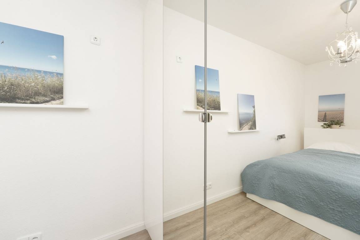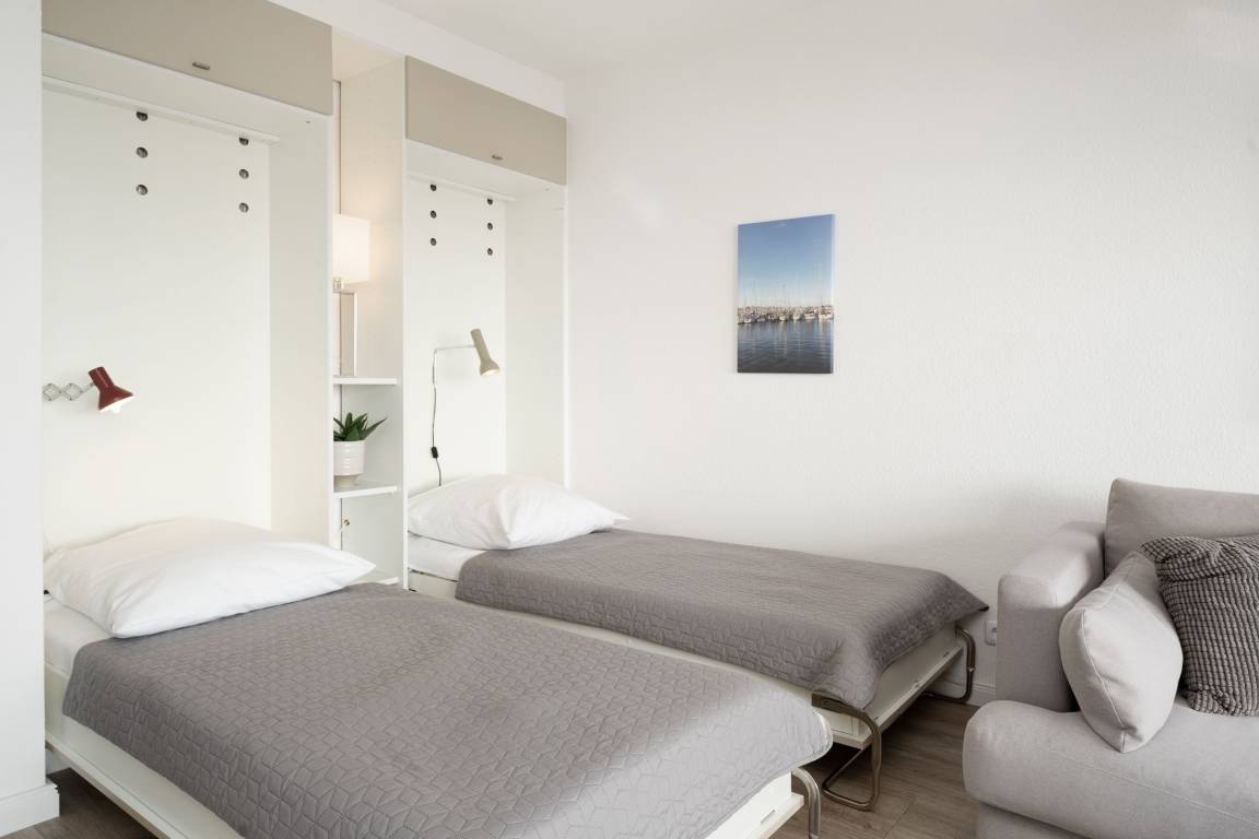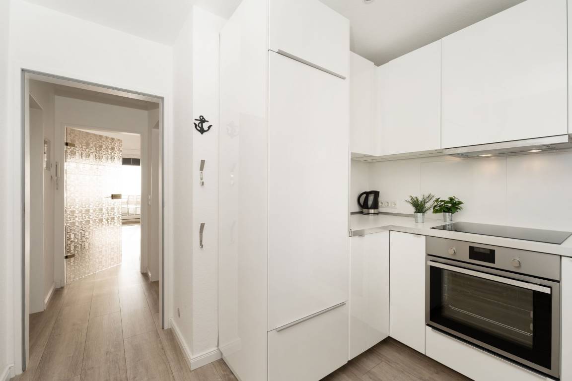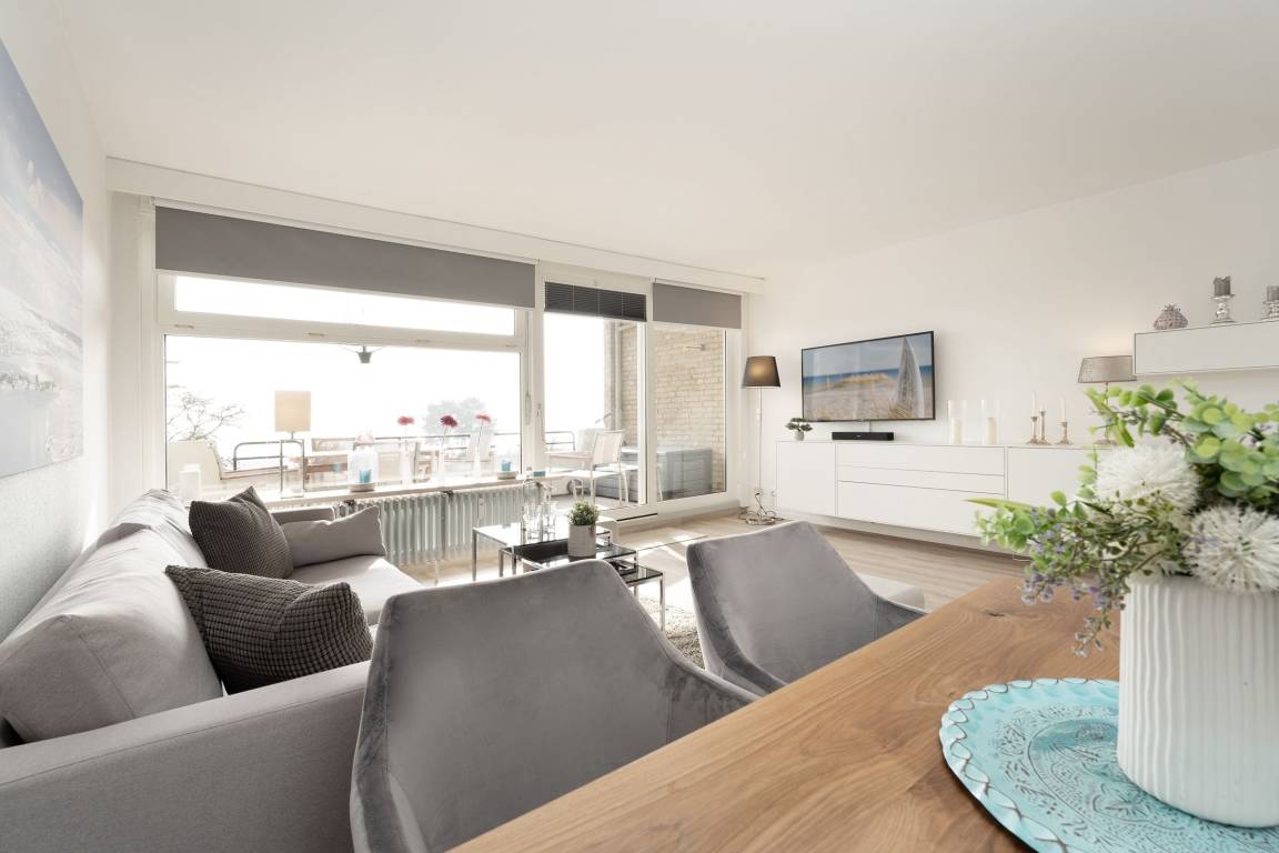 Auszeit mit Aussicht – der Name dieser edlen Wohnung verspricht nicht zu viel: Direkt vom gemütlichen Wohnbereich aus können Sie die Ostsee genießen. Lauschen Sie auf dem möblierten Balkon den Wellen und erfreuen Sie sich an der guten Seeluft. Dank der Überdachung sitzen Sie hier gut geschützt. Für Ihre Selbstversorgung steht Ihnen eine offene Küche mit Extras wie Cafissimo-Maschine und Geschirrspüler zur Verfügung. Geruhsame Nächte versprechen die beiden Schrankeinzelbetten (je 90x200 cm) im Wohnbereich sowie das Doppelbett (2x 90x180 cm) im Schlafzimmer. Das Duschbad bietet den Komfort, den man sich im Urlaub wünscht.