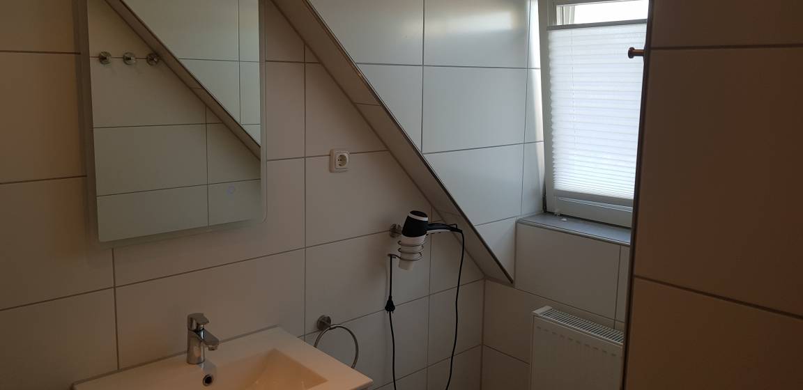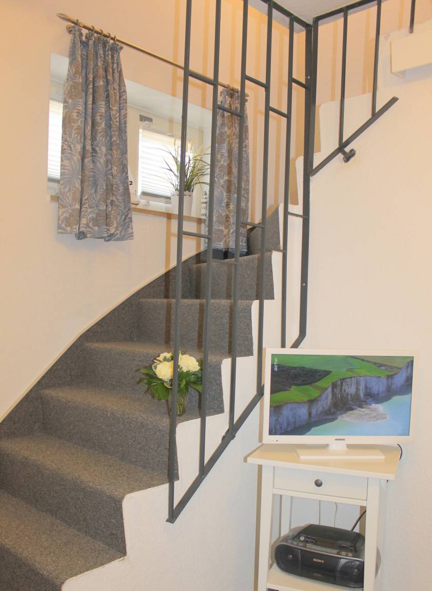 Die Wohnfläche der ca. 63 m ² großen Wohnung verteilt sich über vier Etagen auf ein Wohn- / Esszimmer, einen kleinen Flur mit kleiner Küchenzeile sowie auf zwei Schlafzimmer und auf ein Badezimmer. Die Wohnung ist über einige Treppenstufen zu erreichen, ebenso befinden sich in der Wohnung Treppenstufen. Im Erdgeschoss befindet sich der Wohnbereich, dieser ist mit einer gemütlichen Couchgarnitur (1,50 x 2 m groß, Schlafmöglichkeit für einen Erwachsenen oder zwei Kinder), Essplatz mit vier Stühlen und einem Flachbild-TV versehen. Von hier aus gelangen Sie auf die überdachte und möblierte Terrasse, ein Sonnenschirm ist vorhanden. Auf der Terrasse darf gern geraucht werden. Die Terrasse ist mit einem Glasdach versehen und von beiden Seiten wind- und sichtgeschützt, das "zweite Wohnzimmer" kann also fast das ganze Jahr über genutzt werden. Im Eingangsbereich ist eine kleine Küchennische vorhanden, diese ist u.a. mit 2er Ceranfeldherd, Kühlschrank mit Gefrierfach, einem Geschirrspüler und einer Mikrowelle mit Aufbackfunktion sowie weiteren Küchengeräten ausgestattet. Ein Backofen ist nicht vorhanden. Im Souterrain befindet sich eins der beiden Schlafzimmer, ein Kojen-Einzelbett (ausziehbar zum Doppelbett, 1,60 m x 2,00 m) sowie ein Kleiderschrank und ein TV sind hier vorhanden. In der ersten Etage befindet sich das Tageslicht-Badezimmer, dieses ist mit einer Dusche, einem großen Waschtisch, einem WC und Einbauschränkchen versehen. Einige Treppenstufen weiter oben steht für Sie das zweite Schlafzimmer zur Verfügung, es ist mit einem Doppelbett (Maße: 1,60 x 2,00 m), einem Einbaukleiderschrank sowie einem Spiegel versehen.