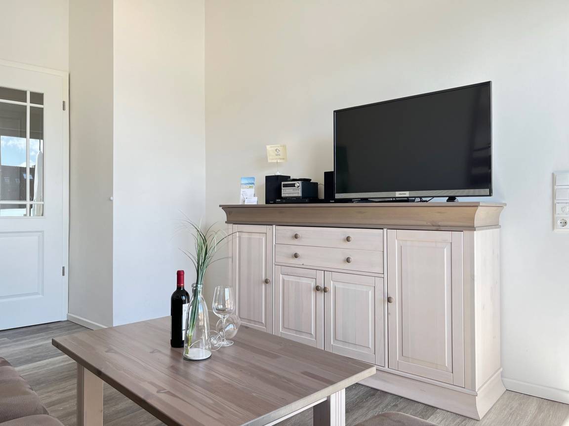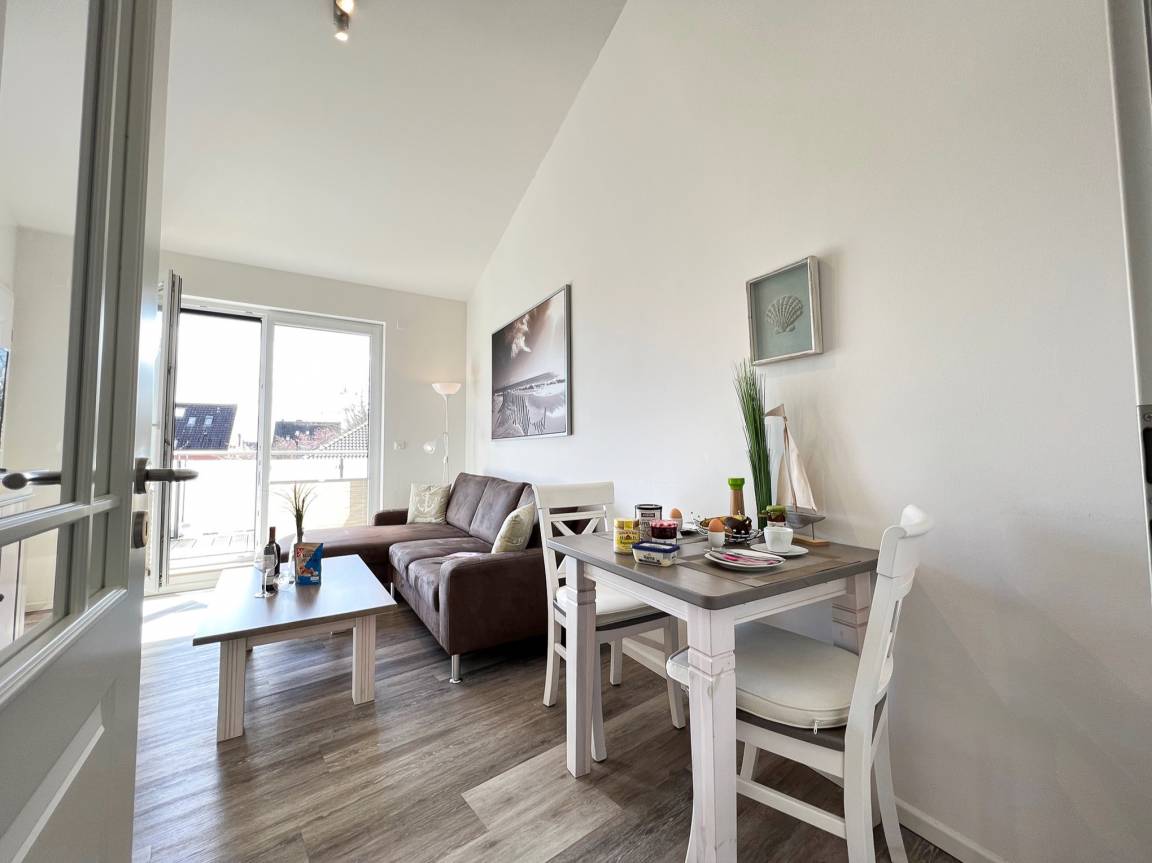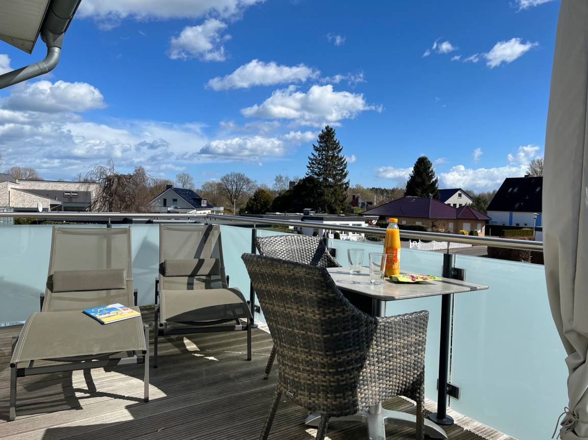 Vom Flur aus gelangt man in das helle und sonnige Wohn- und Esszimmer (mit Flachbild-TV, Hifi-Anlage und kostenlosem Internetzugang). Durch das Wohnzimmer geht es auf die 15 qm große Süddachterrasse. Eine gemütliche Sitzecke und Sonnenliegen laden zum Ausspannen ein.