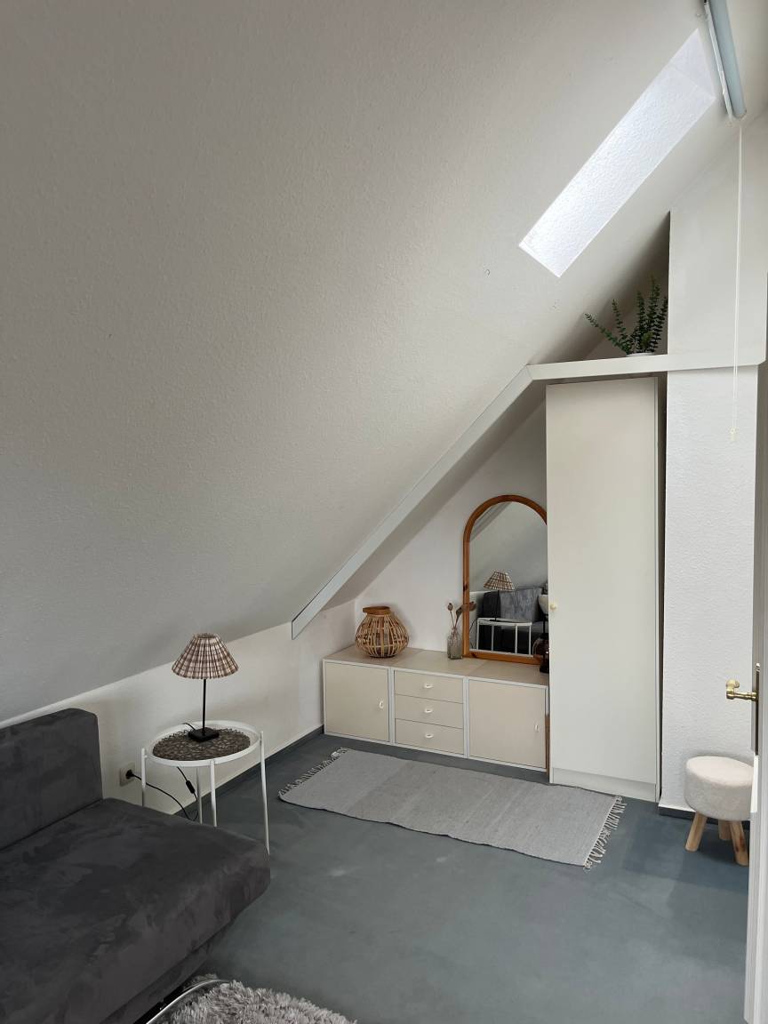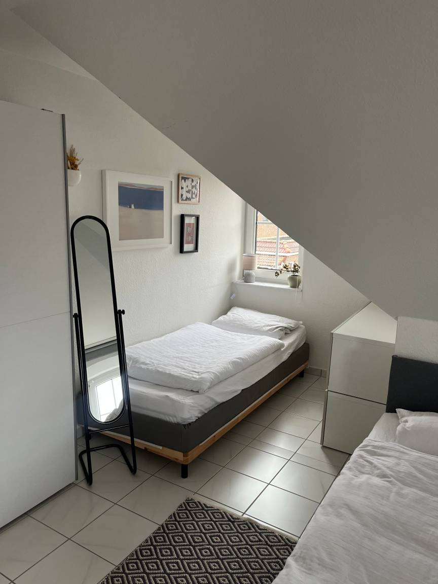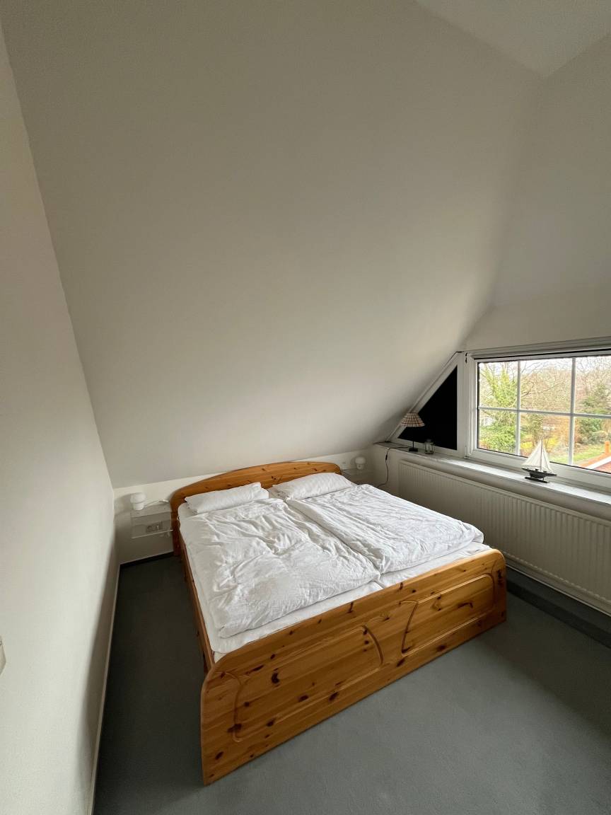 Im Dachgeschoss erwartet Sie ein charmantes Zimmer mit großem Doppelbett, Schlafsofa und Meerblick auf die Lübecker Bucht - ein ruhiger Rückzugsort unterm Spitzdach. Ein weiteres Schlafzimmer im Erdgeschoss bietet ein modernes Doppelbett sowie ein Einzelbett.