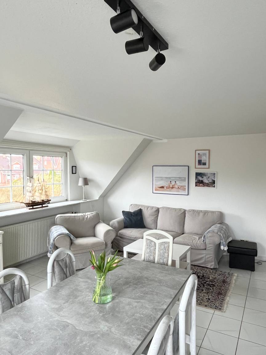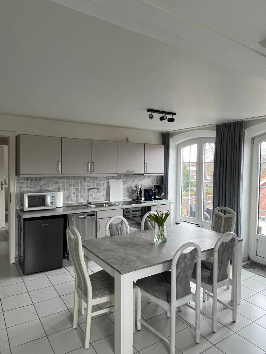 Die Wohnung überzeugt durch ihre helle und offene Wohnküche, die zum gemeinsamen Kochen, Essen und Entspannen einlädt. Die Küchenzeile ist vollständig ausgestattet und lässt keine Wünsche offen. Sie finden hier ein Cerankochfeld, einen Backofen, einen Geschirrspüler, eine Mikrowelle und eine Kaffeemaschine. Ein schöner Essplatz für 6 Personen und eine Couch laden zum Verweilen ein. Kostenloses WLAN, eine Stereoanlage und ein TV stehen zur Verfügung. Vom Wohnbereich aus gelangen Sie direkt auf den Balkon, auf dem Sie sonnige Stunden oder den Abend bei einem Glas Wein und einem Barbecue im Strandkorb genießen können.