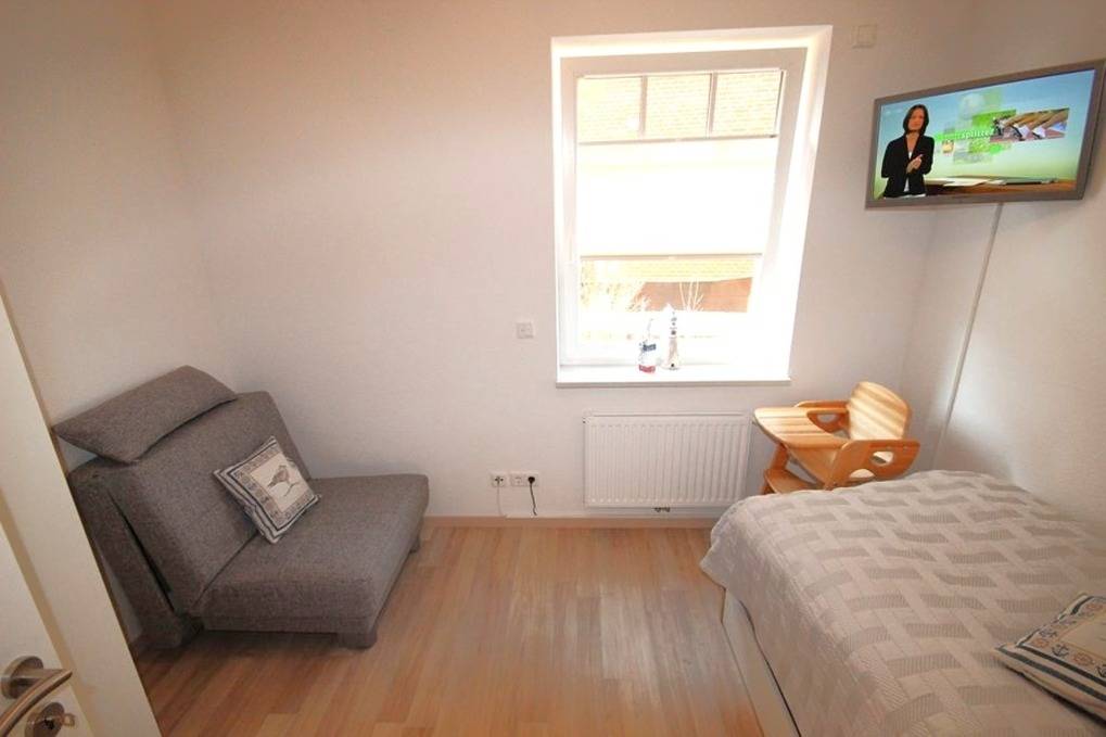 Im 2. Schlafzimmer befindet sich ein Einzelbett, Schlafsessel, Kleiderschrank & TV.