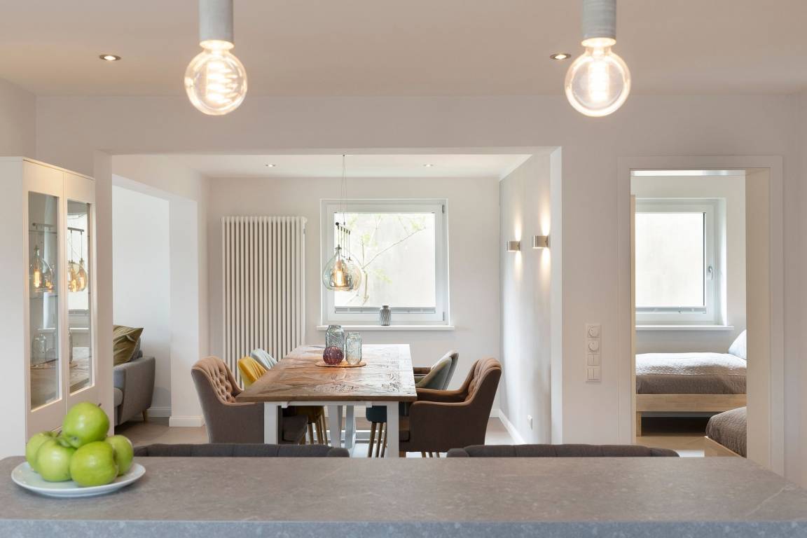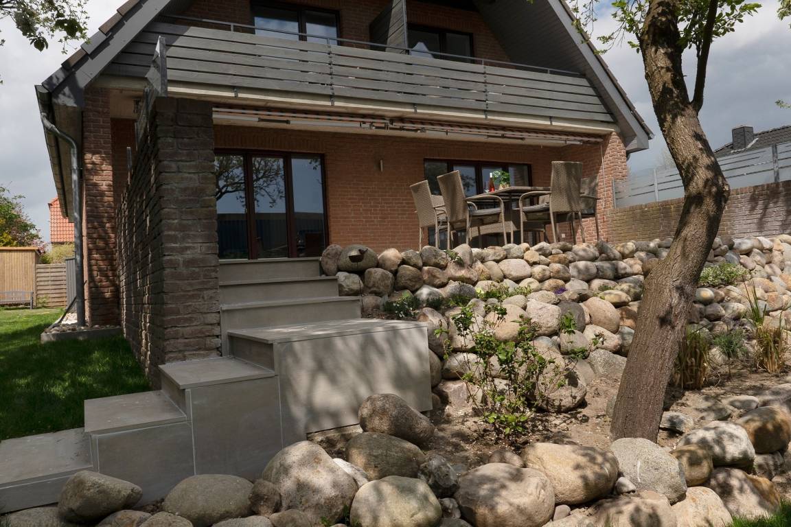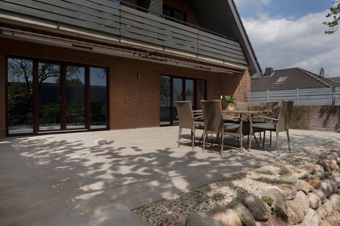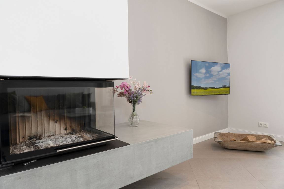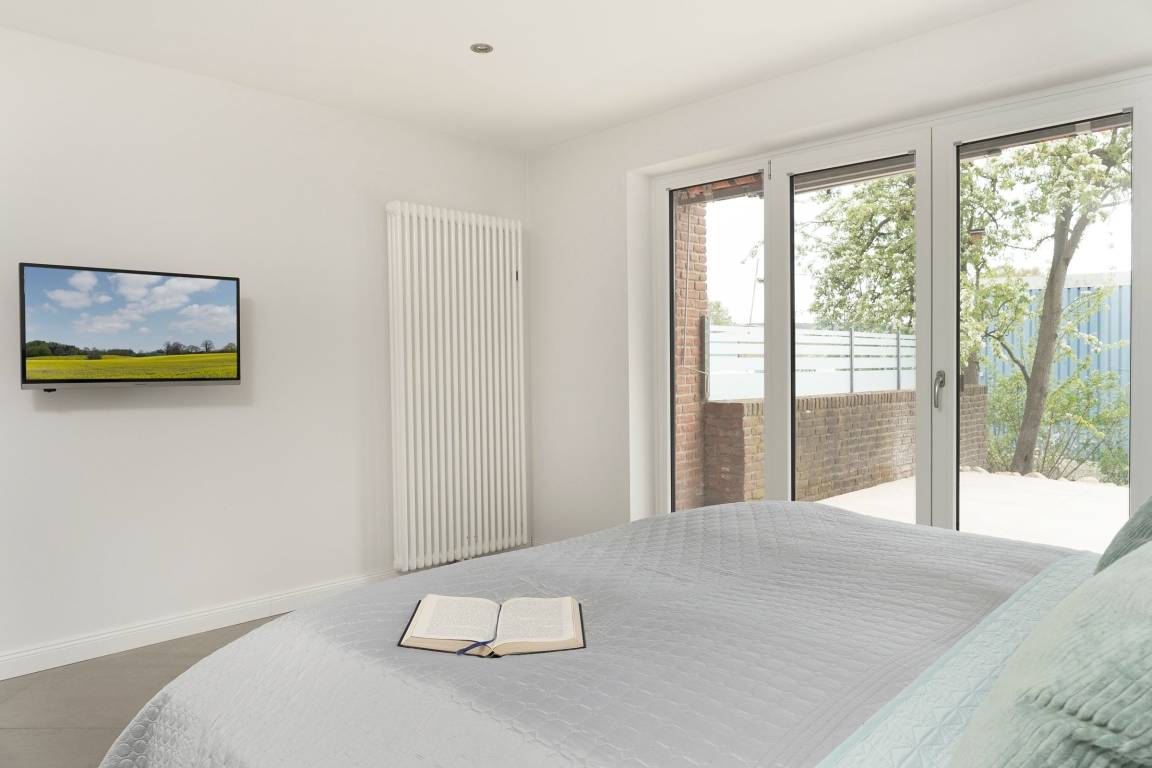 Das schlichte, aber elegante Design im offenen Wohn-/Ess- und Kochbereich wird Sie begeistern. Hier ist für die ganze Familie ausgiebig Platz, um gemeinsame Urlaubsmomente zu genießen - die Einrichtung ist neu und hochwertig, der schöne Eckkamin sorgt für Gemütlichkeit. In der voll ausgestatteten Küche finden Sie alles, um ein leckeres Essen zuzubereiten. Vom Wohnbereich und Schlafzimmer aus haben Sie Zugang zur großzügigen möblierten Terrasse mit Blick in den Garten, der gemeinschaftlich von den Gästen des Hauses genutzt werden kann.