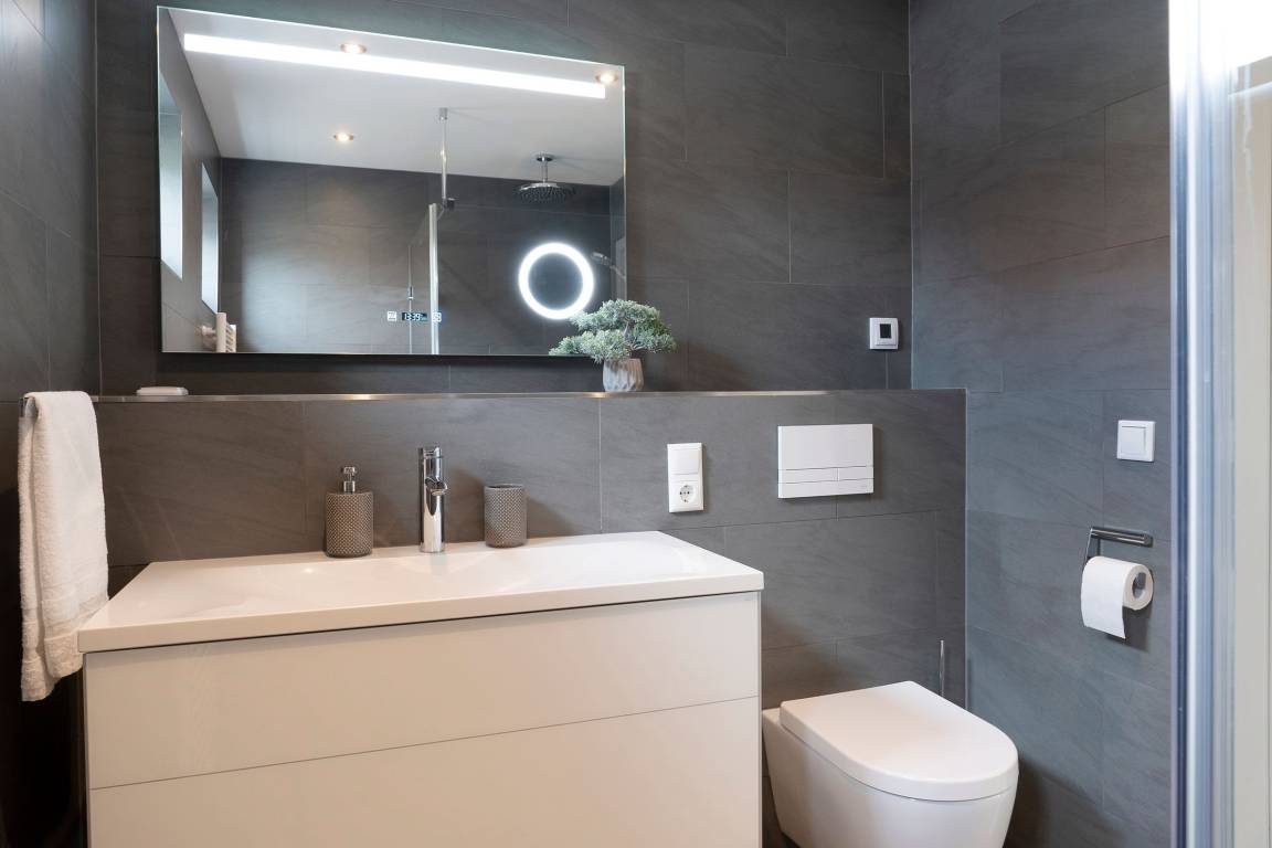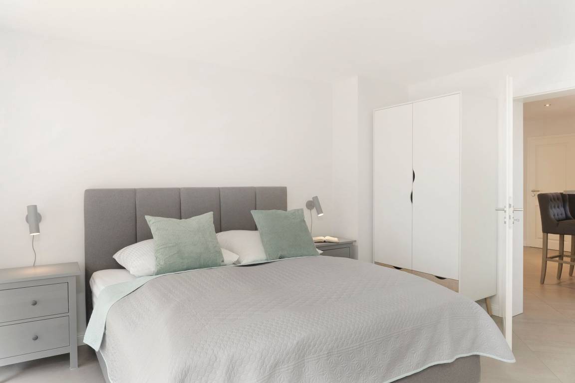 Für erholsame Nächte ziehen Sie sich in die separaten Schlafzimmer zurück. Schlafzimmer 1 punktet mit luxuriösem Boxspringbett (180x200cm), TV und Kleiderschrank. In Schlafzimmer 2 können Sie sich in 2 kuschelige Einzelbetten (je 90x200cm) fallen lassen, auch hier verstauen Sie Ihre Urlaubsgarderobe in einem geräumigen Kleiderschrank. Das moderne Badezimmer unterstreicht die geschmackvolle Ausstattung dieser tollen Ferienwohnung.